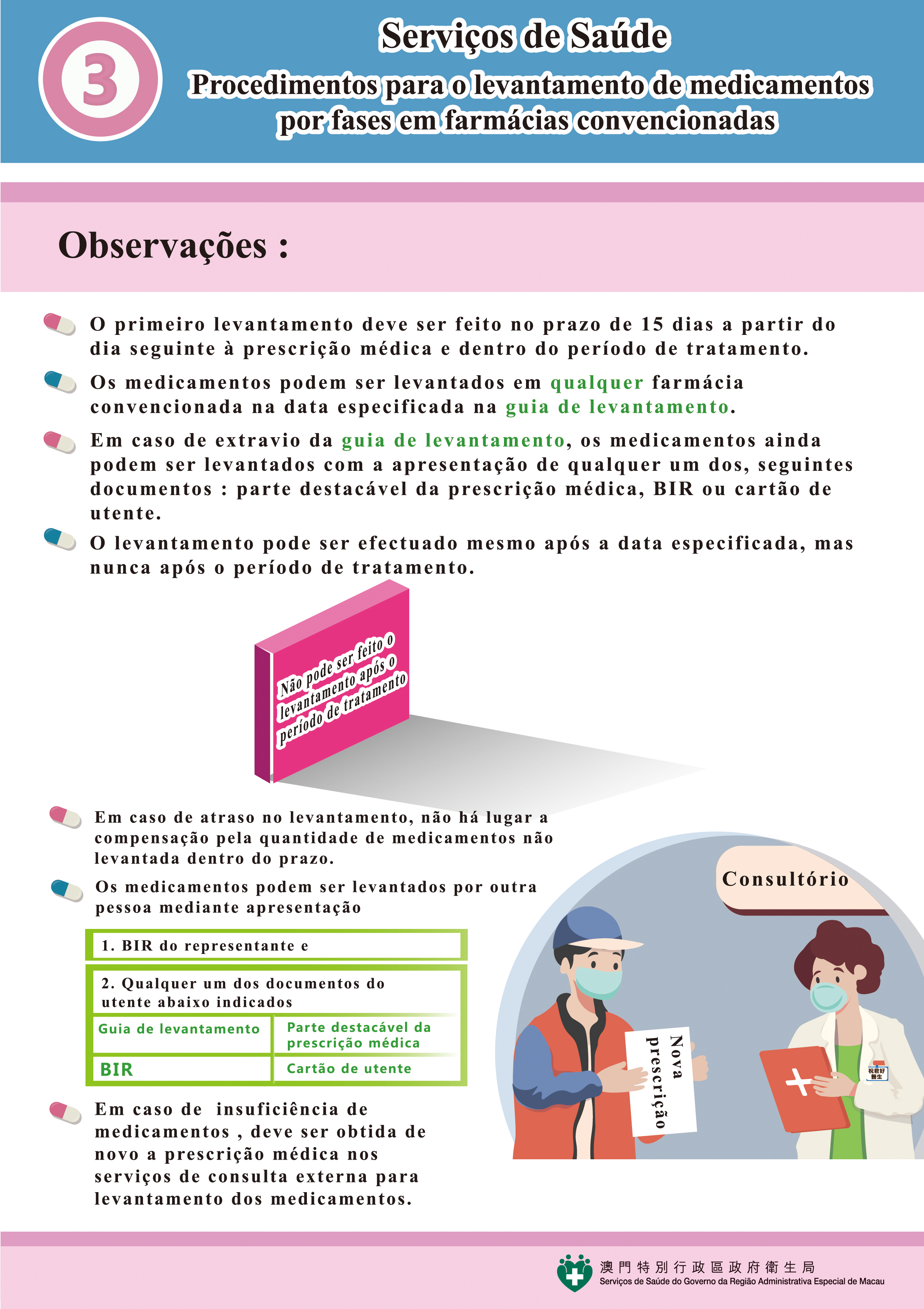 Em caso da falta de medicamentos ser causada pelo extravio ou por outros motivos, os utentes devem recorrer às consultas médicas, pedindo aos médicos a emissão de novo, das prescrições dos medicamentos. Caso os utentes não consigam levantar os seus medicamentos, pessoalmente, o levantamento pode ser feito por outra pessoa mediante apresentação do seu documento de identificação e um dos seguintes documentos do utente: guia de levantamento, parte destacável da prescrição médica original, BIR ou Cartão de Utente dos Serviços de Saúde.