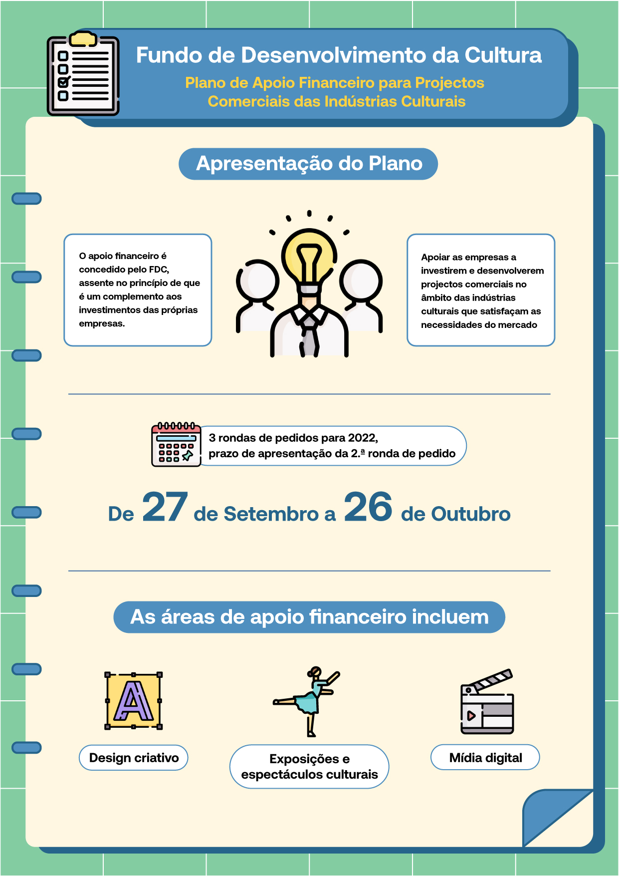 Lançada a 2.ª ronda do “Plano de apoio financeiro para projectos comerciais das indústrias culturais” no ano de 2022 (adiante designado por “Plano”), os empresários comerciais podem apresentar pedidos ao Fundo de Desenvolvimento da Cultura (FDC), de 27 de Setembro a 26 de Outubro.