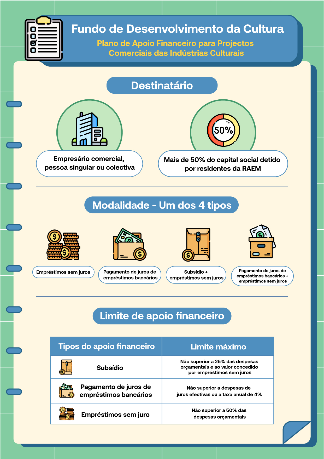 O candidato deve ser empresa comercial, constituída legalmente na RAEM, com mais de 50% do seu capital social detido por residentes da RAEM, ou ser empresário comercial, pessoa singular. Há 4 modalidades de apoio financeiro: empréstimos sem juros, pagamento de juros de empréstimos bancários, subsídio e empréstimos sem juros, pagamento de juros de empréstimos bancários e empréstimos sem juros. As empresas só podem optar por uma das modalidades para o pedido. Caso a empresa esteja no prazo de apoio financeiro, concedido na modalidade de subsídio pelo FDC (antigo Fundo das Indústrias Culturais), e não tenha apresentado o relatório final, ou caso tenha sido financiado sob a modalidade de subsídio por três vezes, só pode pedir a concessão por empréstimos sem juros ou pagamento de juros de empréstimos bancários. No entanto, não será contado o número de concessão no âmbito dos outros planos de apoio financeiro.