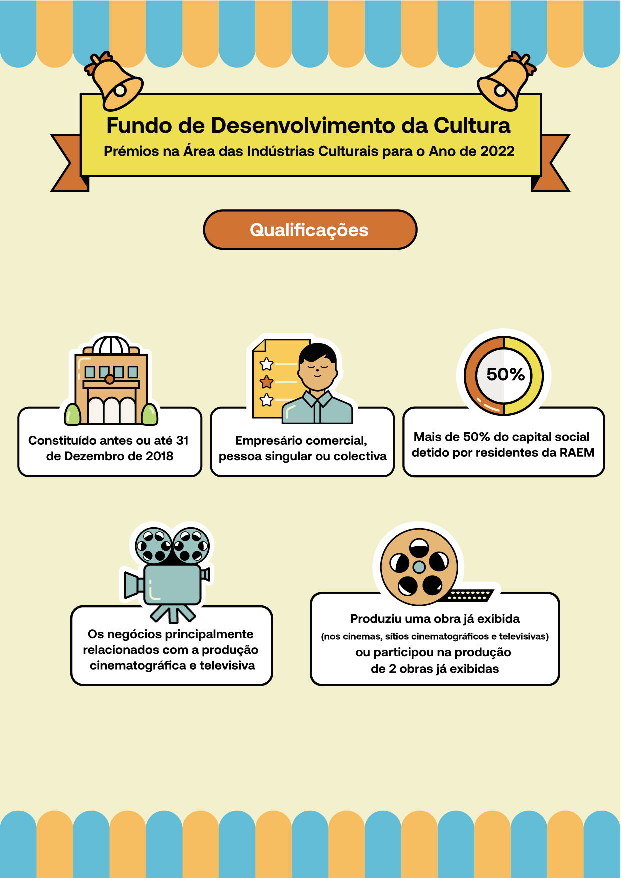 O Fundo de Desenvolvimento da Cultura (FDC) lança os “Prémios na área das indústrias culturais”, criando os “Prémios de excelência de empresas na área das indústrias culturais” - área da produção cinematográfica e televisiva (adiante designado por “Prémios”), de modo a incentivar o sector o desenvolvimento contínuo e a criação de marcas de Macau. Serão aceites os respectivos pedidos entre 27 de Setembro e 4 de Novembro.