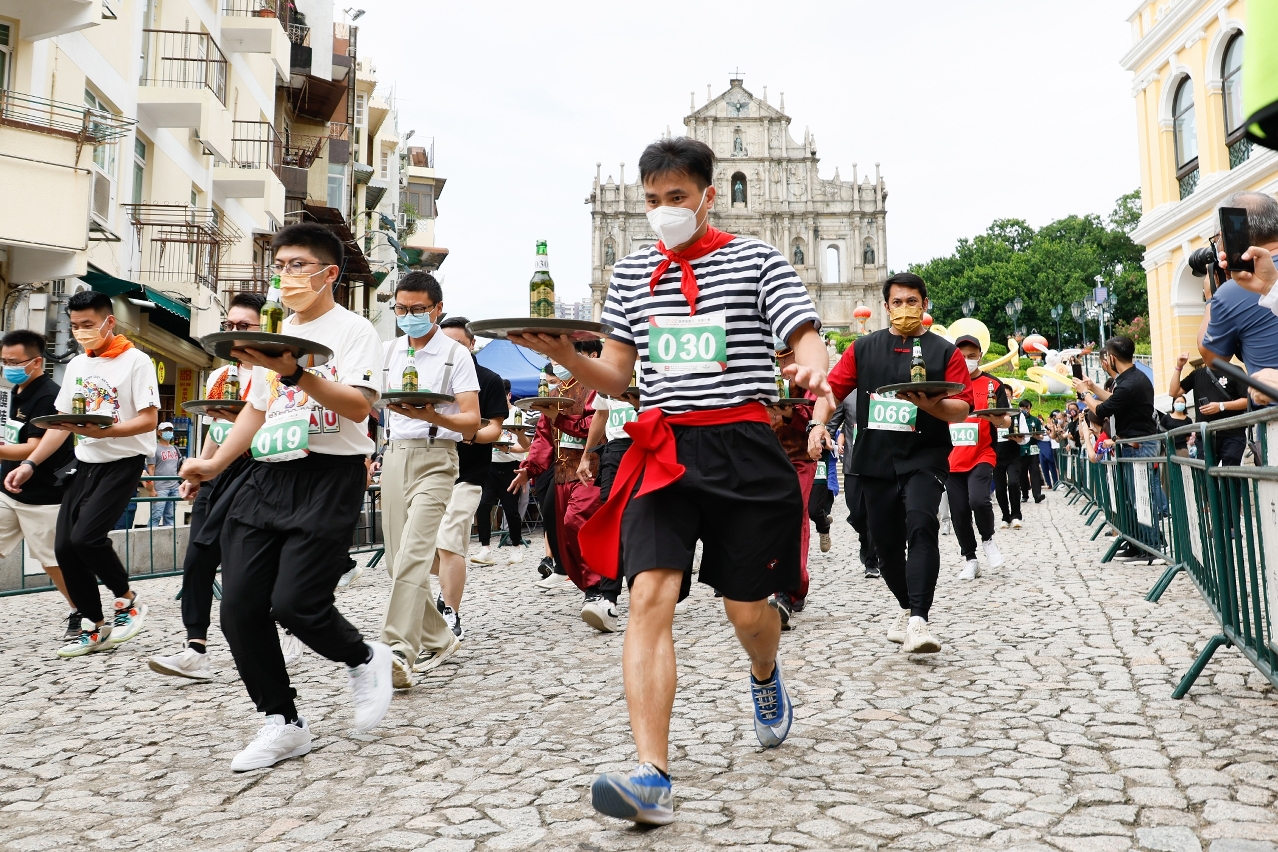 Quando disparou a pistola de partida, a convidada especial - a mascote do turismo de Macau, Mak Mak, vestida de estilo chinês, partiu das Ruínas de S. Paulo em conjunto com os concorrentes, segurando uma bandeja com uma garrafa de cerveja de Macau Beer, para percorrer as ruas do Centro Histórico de Macau, e seguir em velocidade máxima transportando a garrafa de forma segura até à meta final no Largo do Senado, numa atmosfera intensa, atraindo transeuntes ao longo do caminho para ver a corrida.