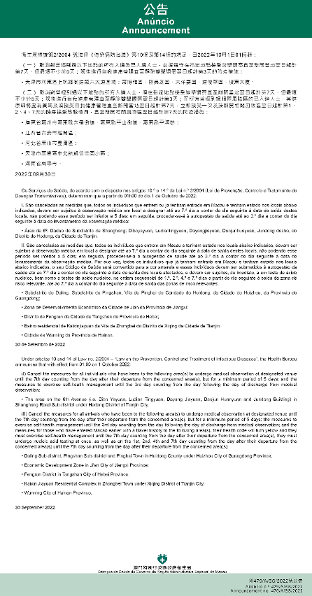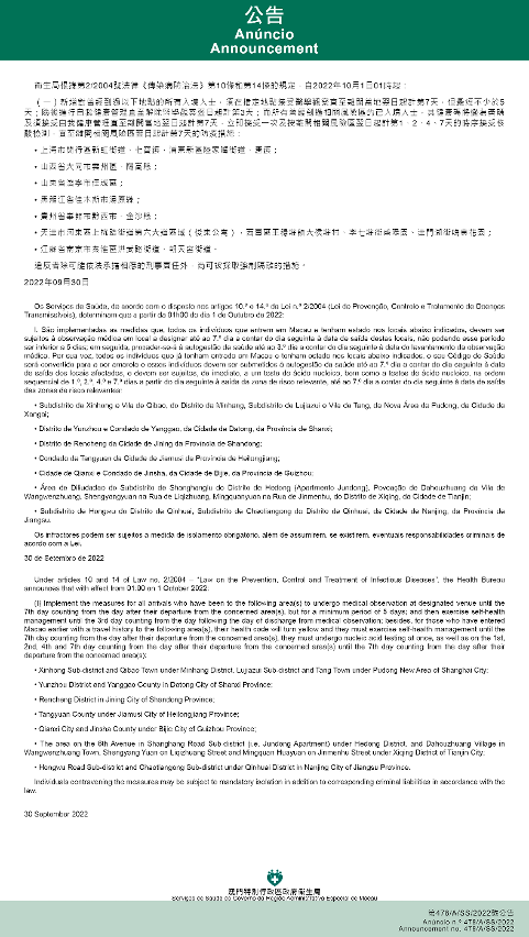 Tendo em consideração a evolução epidemiológica mais actualizada no Interior da China, os Serviços de Saúde, de acordo com o disposto nos artigos 10.º e 14.º da Lei n.º 2/2004 (Lei de Prevenção, Controlo e Tratamento de Doenças Transmissíveis), determinam que a partir da 01h00 do dia 1 de Outubro de 2022, são implementadas ou canceladas as medidas antiepidémicas para quem tenha estado em diversas áreas do Interior da China: