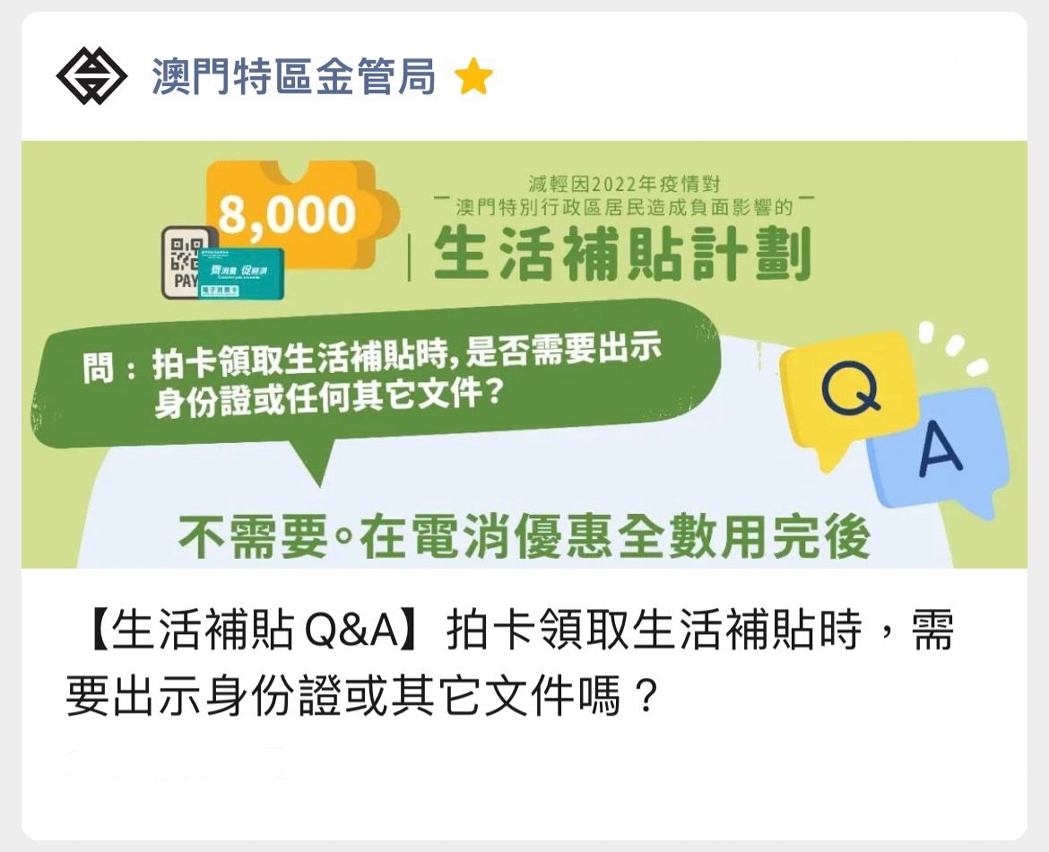 Ao mesmo tempo, a página exclusiva do “Plano de subsídio de vida” já criada, dispõe de uma série de informações e materiais publicitárias, incluindo animações publicitárias, infografias e um conjunto de “questões frequentes”, e a respectiva página exclusiva será também actualizada futuramente, no qual os residentes podem visualizar para obter conhecimentos.