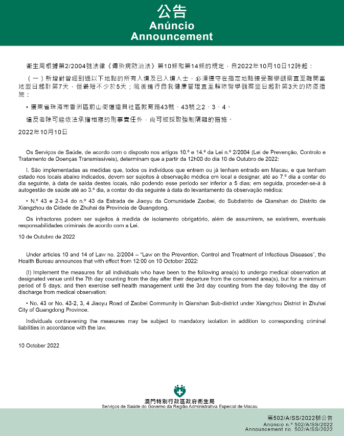 Tendo em consideração a evolução epidemiológica mais actualizada no Interior da China, os Serviços de Saúde, de acordo com o disposto nos artigos 10.º e 14.º da Lei n.º 2/2004 (Lei de Prevenção, Controlo e Tratamento de Doenças Transmissíveis), determinam que a partir das 12h00 do dia 10 de Outubro de 2022, são implementadas as medidas antiepidémicas para quem tenha estado em diversas áreas da Cidade de Zhuhai da Província de Cantão (Guangdong):