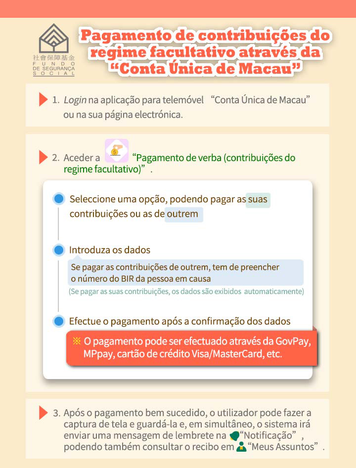 A partir de hoje, durante o mês de pagamento de contribuições, os beneficiários do regime facultativo podem aceder à aplicação para telemóvel “Conta Única de Macau” ou a sua página electrónica (https://www.mo.gov.mo/home), e pagar as contribuições do regime facultativo com o seu número do BIRM, através dos meios electrónicos de pagamento da “GovPay”, Mpay e cartão de crédito, sendo uma forma muito simples e rápida. O pagamento pode ser feito ainda através dos meis electrónicos, balcões e caixas automáticas de JETCO dos bancos designados, quiosques de auto-atendimento com o logotipo do FSS, Centros de Prestação de Serviços ao Público do IAM e respectivos postos, bem como nos postos de atendimento do FSS.