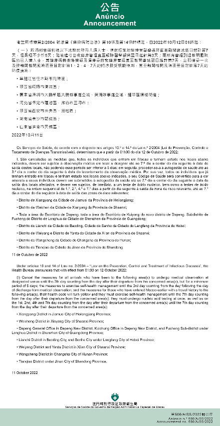 Tendo em consideração a evolução epidemiológica mais actualizada no Interior da China, os Serviços de Saúde, de acordo com o disposto nos artigos 10.º e 14.º da Lei n.º 2/2004 (Lei de Prevenção, Controlo e Tratamento de Doenças Transmissíveis), determinam que a partir da 01h00 do dia 12 de Outubro de 2022, são implementadas ou canceladas as medidas antiepidémicas para quem tenha estado em diversas áreas do Interior da China: