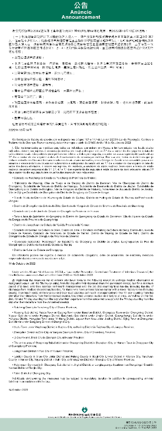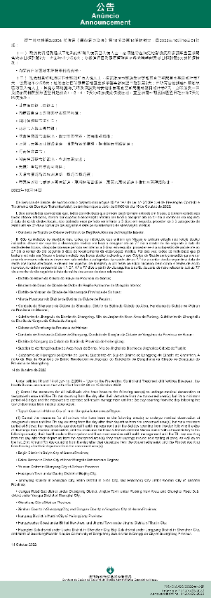 Tendo em consideração a evolução epidemiológica mais actualizada no Interior da China, os Serviços de Saúde, de acordo com o disposto nos artigos 10.º e 14.º da Lei n.º 2/2004 (Lei de Prevenção, Controlo e Tratamento de Doenças Transmissíveis), determinam que a partir da 01h00 do dia 15 de Outubro de 2022, são implementadas ou canceladas as medidas antiepidémicas para quem tenha estado em diversas áreas do Interior da China: