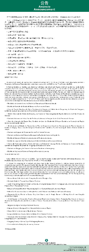 Tendo em consideração a evolução epidemiológica mais actualizada no Interior da China, os Serviços de Saúde, de acordo com o disposto nos artigos 10.º e 14.º da Lei n.º 2/2004 (Lei de Prevenção, Controlo e Tratamento de Doenças Transmissíveis), determinam que a partir da 01h00 do dia 17 de Outubro de 2022, são implementadas ou canceladas as medidas antiepidémicas para quem tenha estado em diversas áreas do Interior da China: