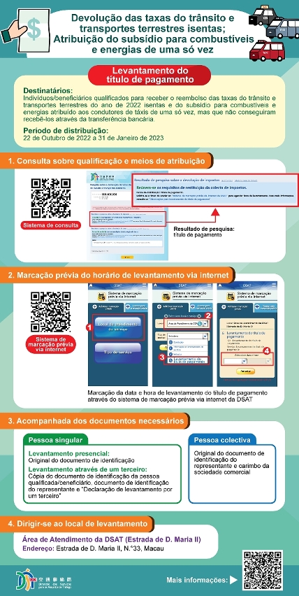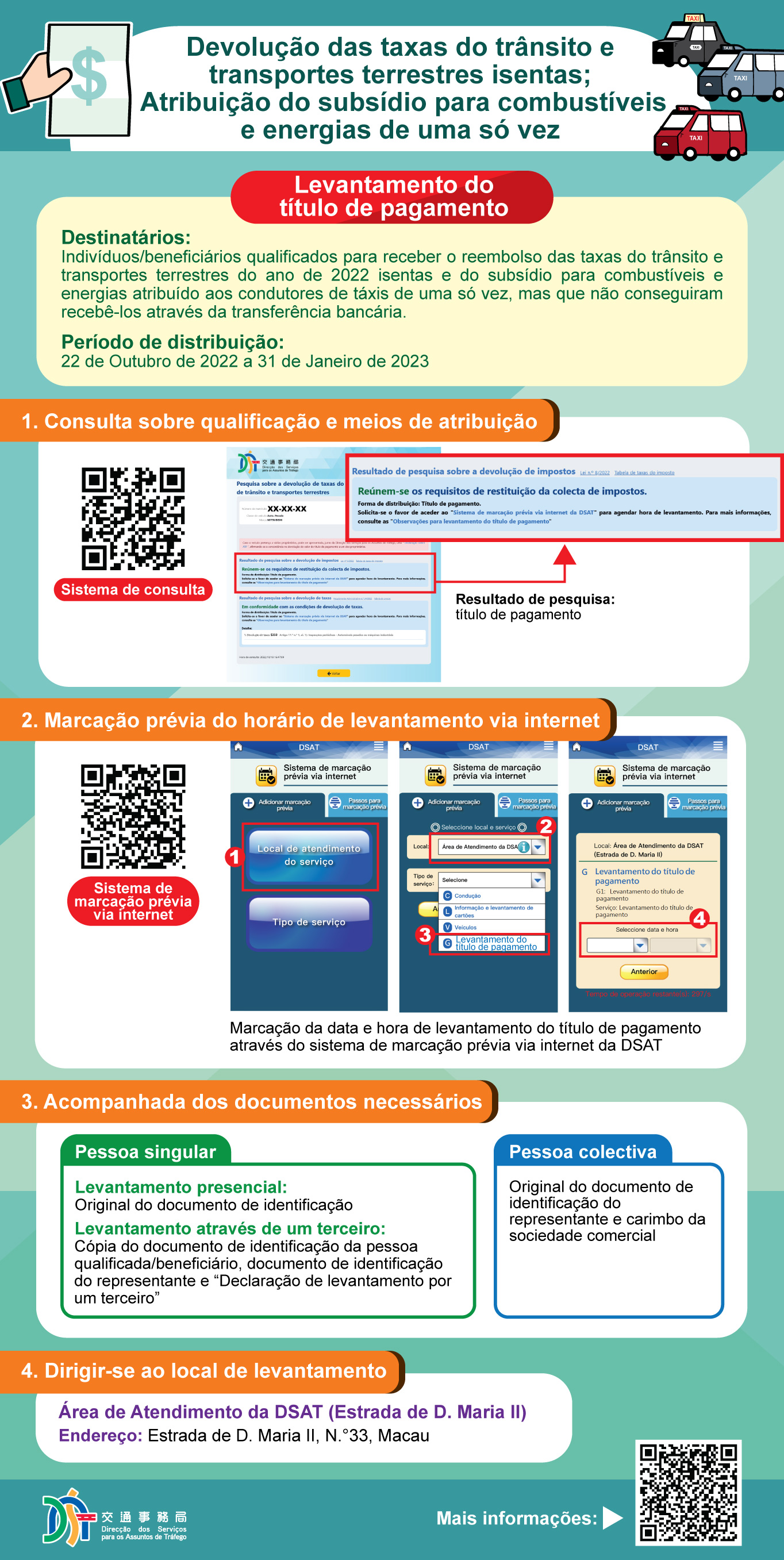 Os interessados qualificados podem consultar as informações relativas à devolução das taxas e os meios de atribuição do subsídio através do sistema de consulta online (www.dsat.gov.mo/r/eq.htm). Se o resultado de pesquisa demonstra que os montantes serão atribuídos por título de pagamento, pode marcar previamente no sistema de marcação prévia via internet da DSAT a data e hora de levantamento que começará no dia 22 de Outubro e, conforme a hora marcada, dirigir-se à área de atendimento da DSAT sita na Estrada de D. Maria para o levantamento do título de pagamento, munido dos documentos necessários. No dia 22 de Outubro (sábado) será aberta das 9h às 18h apenas para atender aos indivíduos que tenham marcado o levantamento do título de pagamento para o dia. Para mais informações sobre o levantamento do título de pagamento consulte a página https://www.dsat.gov.mo/r/eq1.htm.