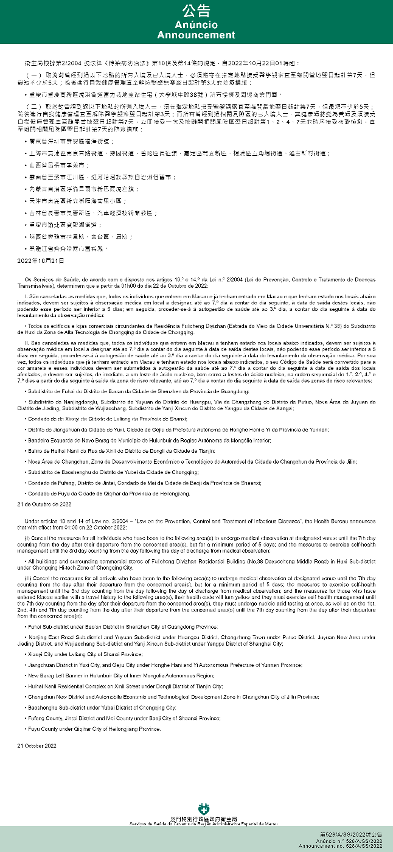 Tendo em consideração a evolução epidemiológica mais actualizada no Interior da China, os Serviços de Saúde, de acordo com o disposto nos artigos 10.º e 14.º da Lei n.º 2/2004 (Lei de Prevenção, Controlo e Tratamento de Doenças Transmissíveis), determinam que a partir da 01h00 do dia 22 de Outubro de 2022, são implementadas ou canceladas as medidas antiepidémicas para quem tenha estado em diversas áreas do Interior da China: