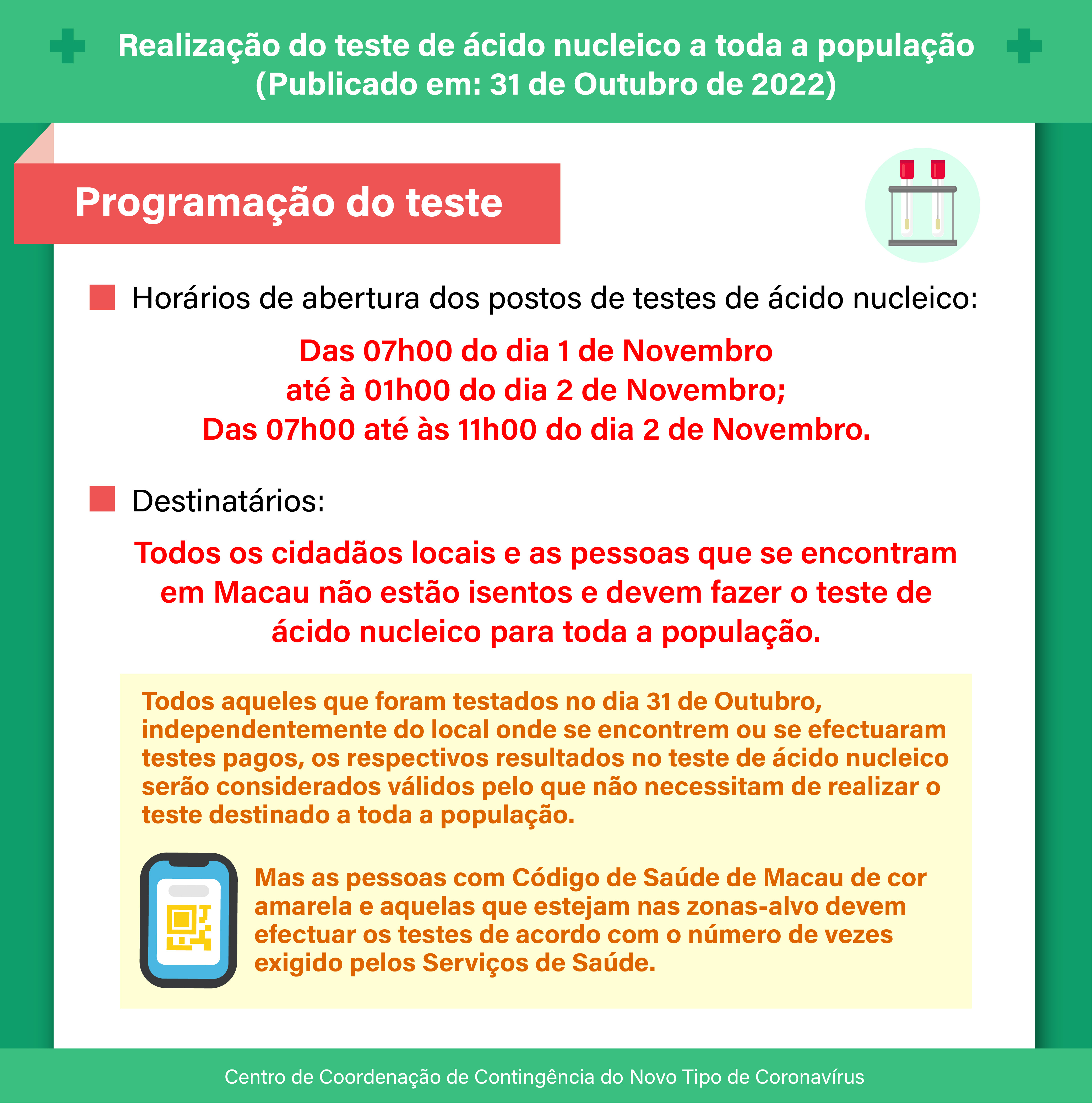 O Centro de Coordenação de Contingência do Novo Tipo de Coronavírus anuncia que o teste massivo de ácido nucleico, será realizado a partir do dia 1 de Novembro (Terça-feira), pelas 07h00 até ao dia 2 de Novembro (Quarta-feira), pelas 11h00.