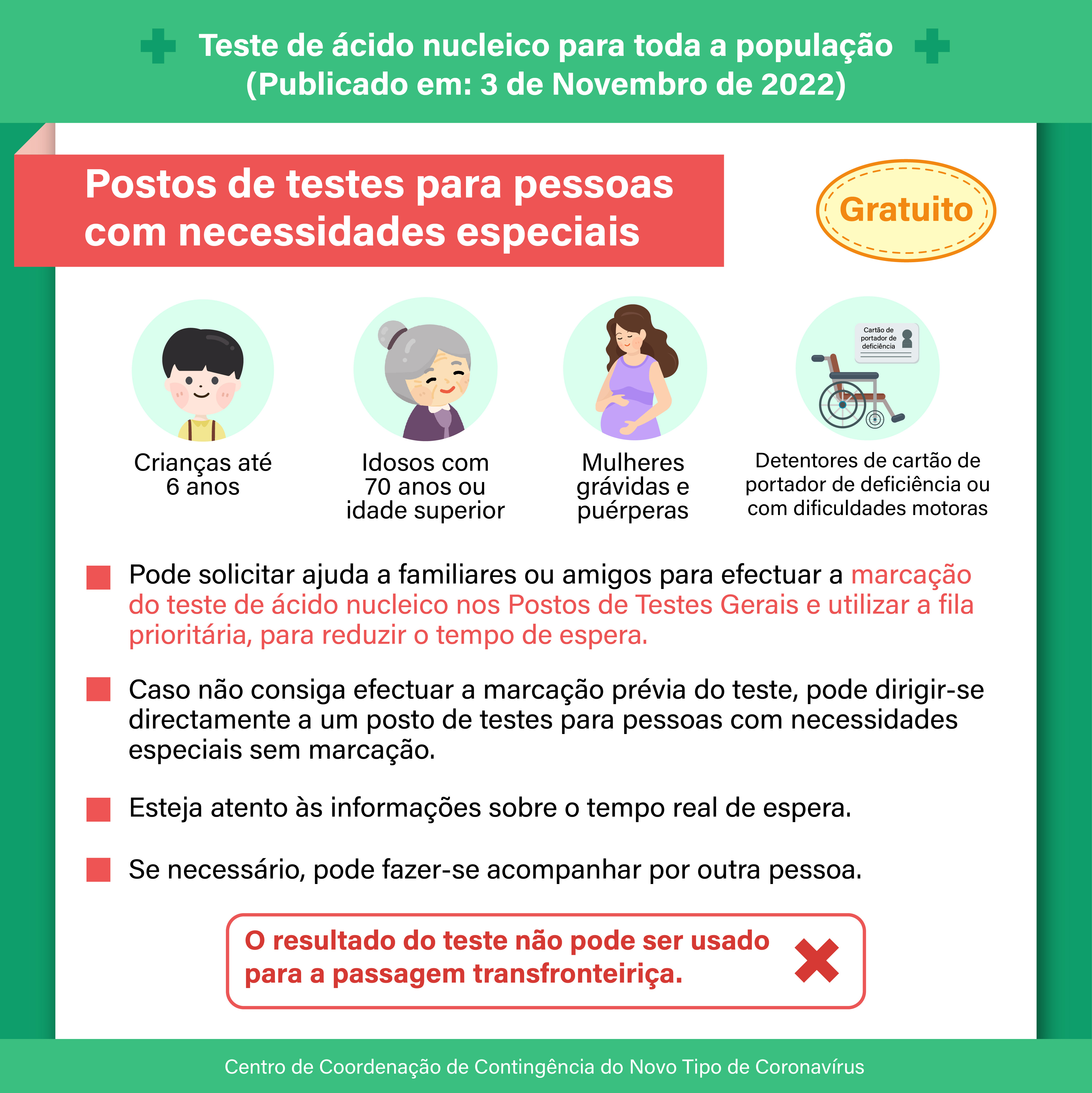 - São criadas filas prioritárias nos postos de testes de ácido nucleico gerais e nos postos de testes de ácido nucleico ao ar livre. Relativamente aos postos de testes destinados as pessoas com necessidades especiais e as filas prioritárias com prioridade, estão abertos para as crianças com idade igual ou inferior a 6 anos, idosos com idade igual ou superior a 70 anos, mulheres grávidas e puérperas, portadores de cartão de registo de avaliação da deficiência, e as pessoas com dificuldade na deslocação. Se for necessário, estas pessoas podem ser acompanhadas por uma pessoa.