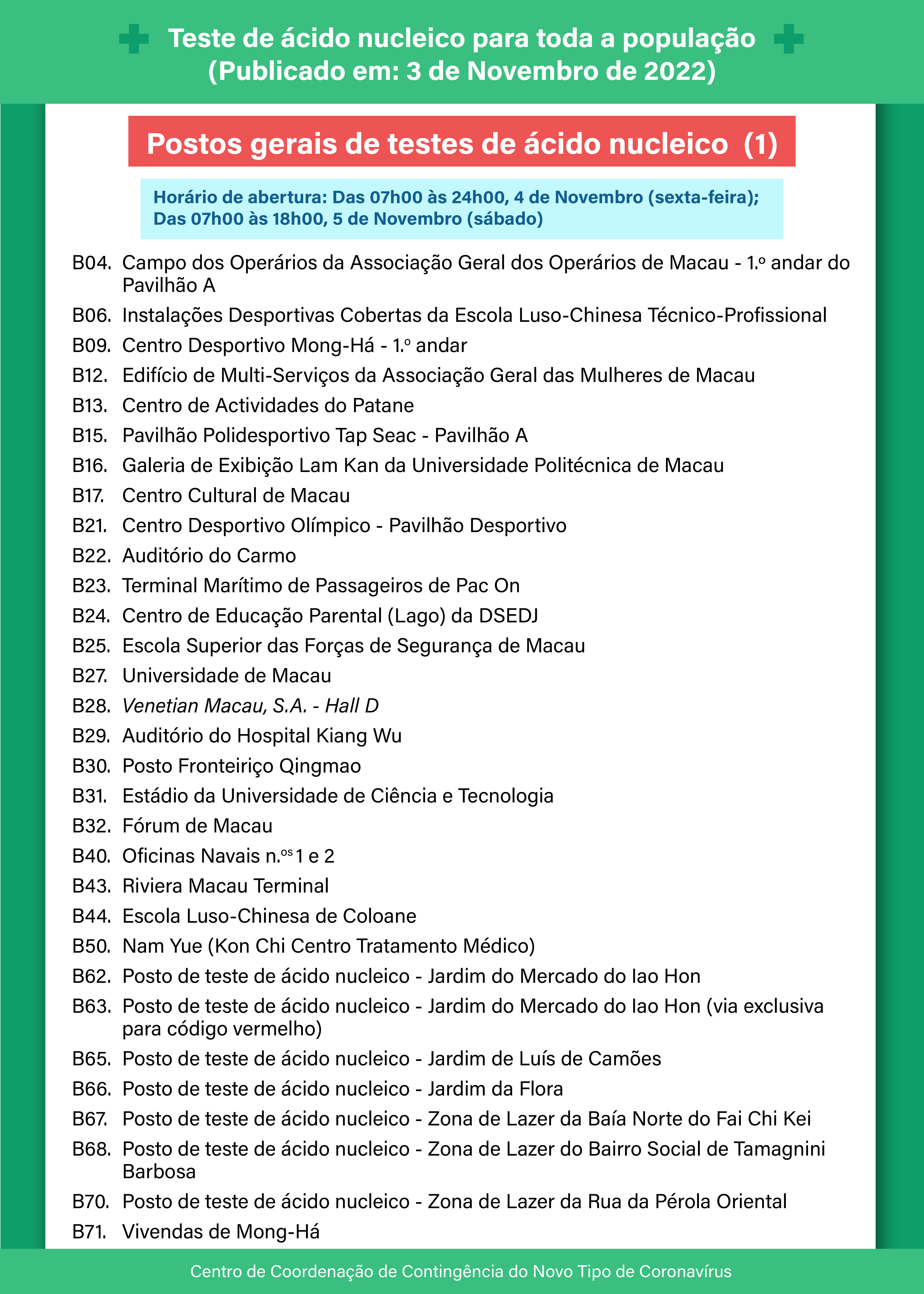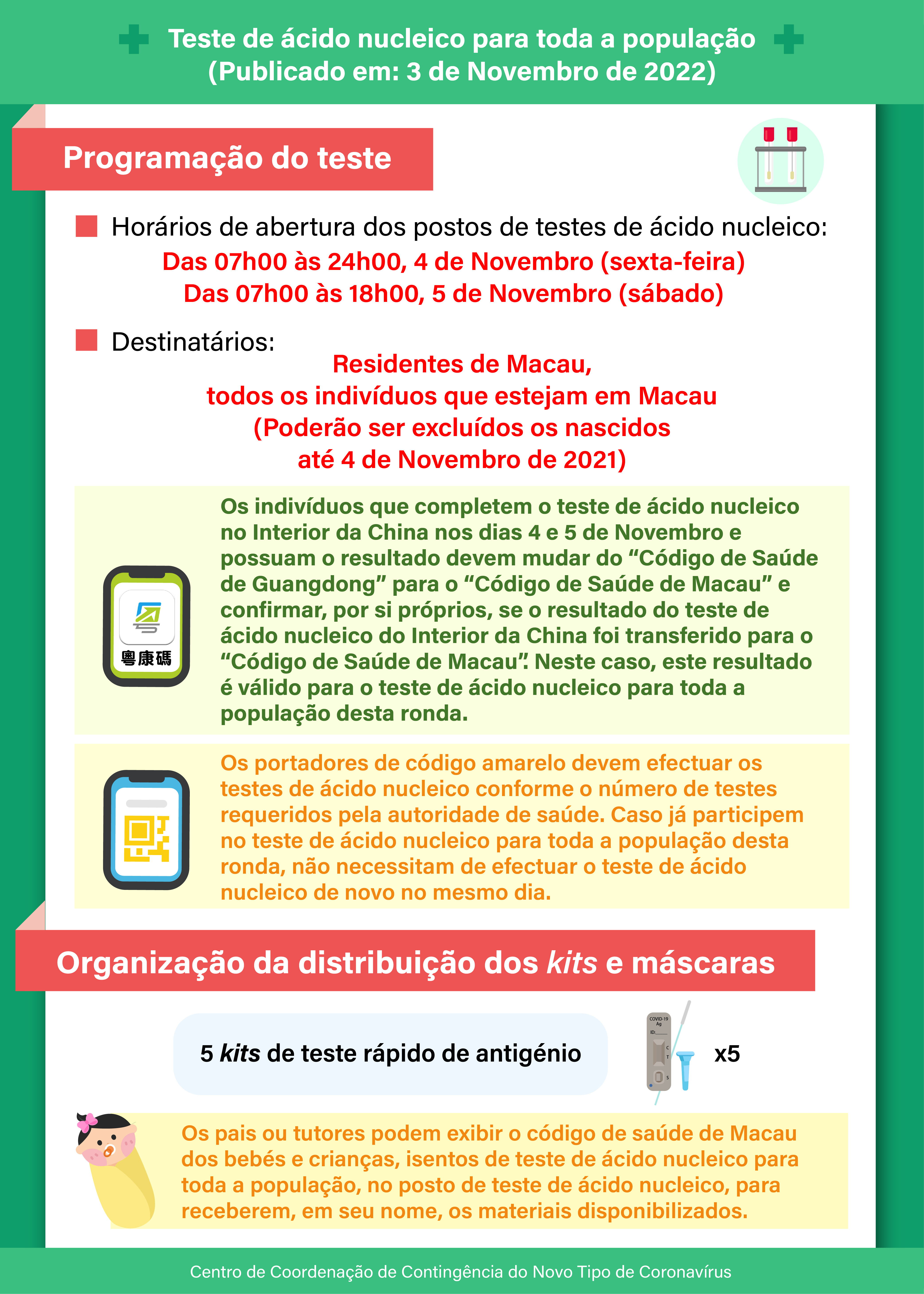 O Centro de Coordenação de Contingência do Novo Tipo de Coronavírus anuncia que a 2.ª ronda do teste de ácido nucleico para toda a população, nos dias 4 e 5 de Novembro, os pormenores são os seguintes: