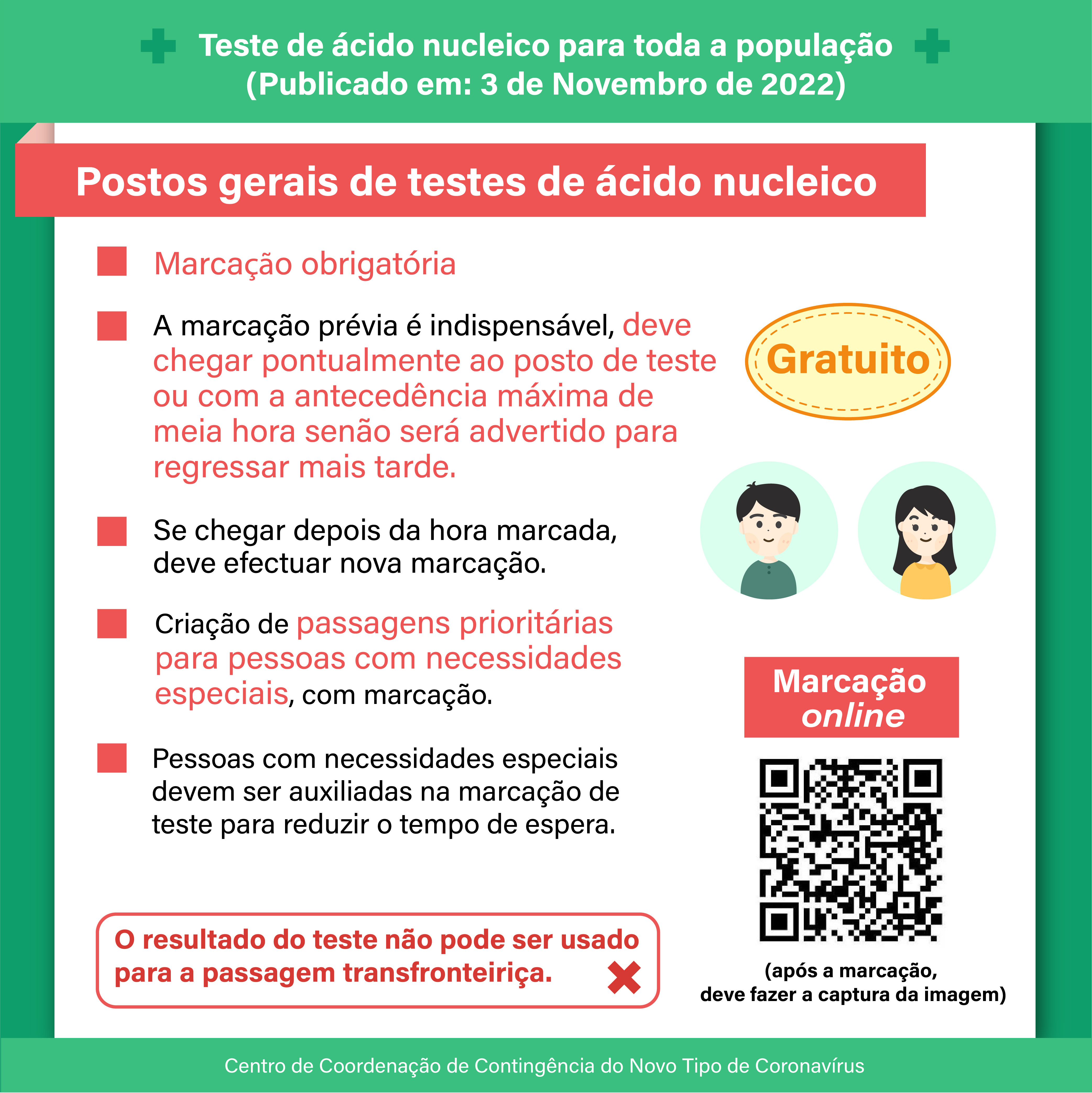 - O sistema de marcação está disponível a partir das 21h00 do dia 03 de Novembro, pela página electrónica de marcação gratuita (https://eservice.ssm.gov.mo/allpeoplernatestbook), e o resultado deste teste não pode ser usado para a passagem fronteiriça.