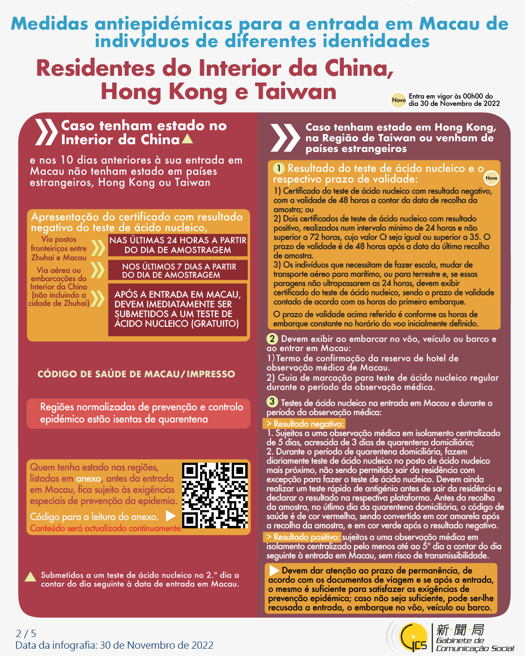 (Infografia) Medidas antiepidémicas para a entrada em Macau de indivíduos de diferentes identidades, actualizadas no dia 30 de Novembro de 2022.
