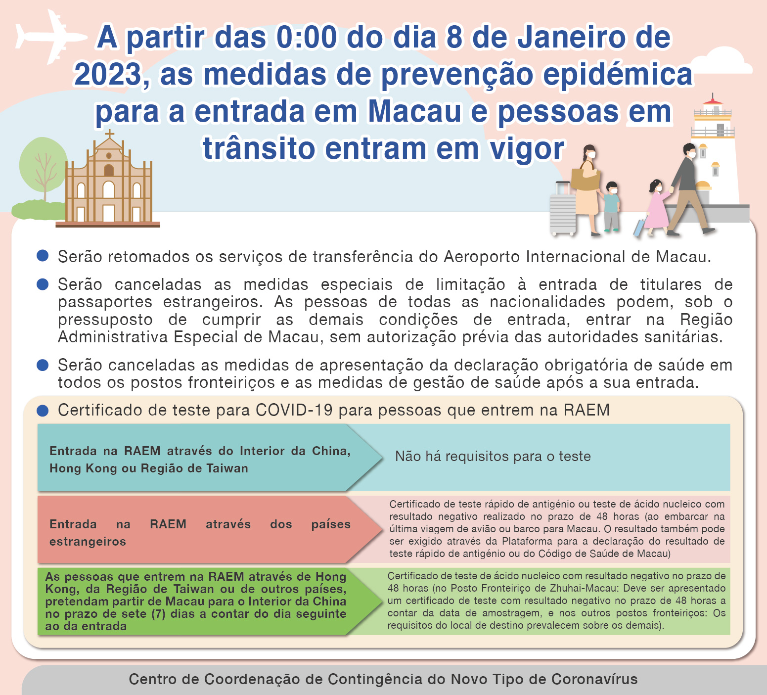 O Centro de Coordenação de Contingência do Novo Tipo de Coronavírus anunciou que, no dia 5 de Janeiro de 2023, foram publicados os Despachos do Chefe do Executivo n.os 1/2023 e 2/2023 no Boletim Oficial da Região Administrativa Especial de Macau, revogando os Despachos do Chefe do Executivo n.os 80/2020 e 43/2021. Por sua vez, os Serviços de Saúde também elaboraram o Anúncio n.o 001/A/SS/2023 para actualizar as medidas de prevenção epidémica para a entrada em Macau e pessoas em trânsito. A partir das 00:00 do dia 8 de Janeiro de 2023, as seguintes medidas entrarão em vigor: