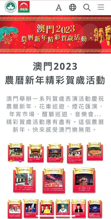 A DST também planeia promover o turismo de Macau e as actividades festivas do Ano Novo Lunar através de plataformas online e presenciais antes e depois dos feriados, incluindo através da publicação de anúncios e actividades de transmissão em directo nas redes sociais, do lançamento de páginas temáticas em cooperação com plataformas de turismo online do Interior da China, o convite a influenciadores digitais de turismo para a transmissão e promoção em directo nos seus canais, a colocação de publicidade em canais televisivos, entre outros. Ao mesmo tempo, a DST continua a promover as actividades do mês “Sentir Macau, Sem Limites”, promovendo activamente as actividades de grande envergadura de cada mês.