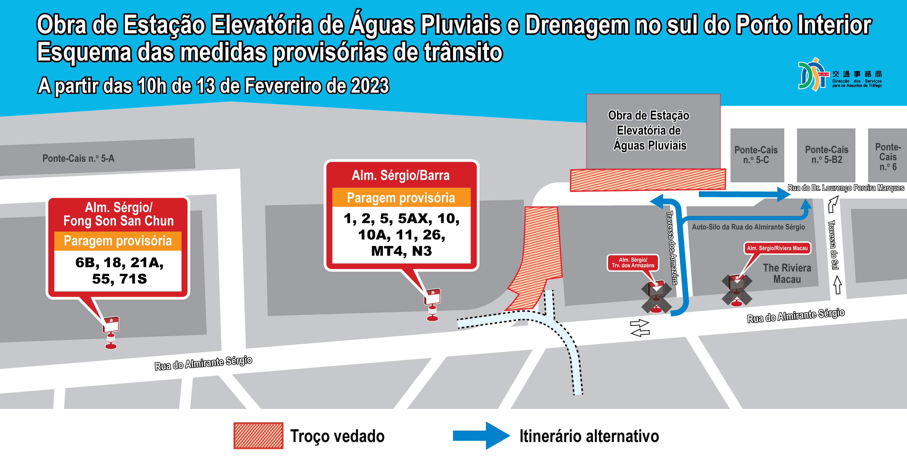 A Direcção dos Serviços de Obras Públicas (DSOP) deu início, no final de Novembro do ano passado, à Obra de Estação Elevatória de Águas Pluviais e Drenagem no sul do Porto Interior. Na medida em que a execução da obra avança, as vias ao longo do Porto Interior serão, de forma faseada, encerradas e progressivamente estreitas. A Rua do Dr. Lourenço Pereira Marques junto do troço da Rua do Almirante Sérgio será vedada ao trânsito, a partir das 10 horas do dia 13 de Fevereiro até ao dia 10 de Junho, com a suspensão das paragens de autocarros “Alm. Sérgio/ Trv. dos Armazéns” e “Alm. Sérgio/ Riviera Macau”, em alternativa, as paragens “Alm. Sérgio/ Barra” e “Alm. Sérgio / Fong Son San Chun” serão servidas em substituição das últimas paragens referidas (vide na tabela). Para assegurar o fluxo do trânsito durante a execução da obra, o passeio pedonal na Travessa do Sal perto da Rua do Dr. Lourenço Pereira Marques foi alvo de ser diminuído o nivelamento. Com isto, os veículos poderão, passando pela Travessa dos Armazéns e pelo Terminal de autocarros de Riviera, virar à esquerda para circular na Rua do Dr. Lourenço Pereira Marques.
