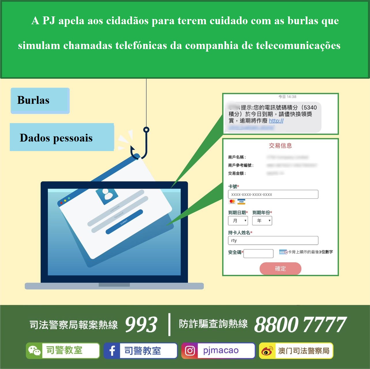 Recentemente, a Polícia Judiciária recebeu dois casos de burla. Num deles, a vítima recebeu um SMS com um link falso que fingia ser da companhia de telecomunicações de Macau, e que dizia que o prazo de validade dos pontos de bónus ia expirar, para levar a vítima a fazer o login num site falso e trocar as prendas. Seguindo as instruções, a vítima deu as informações do cartão de crédito e código de verificação. Logo a seguir, a vítima recebeu uma notificação de uma instituição financeira sobre um consumo desconhecido feito através do seu cartão de crédito, suspeitou que os dados do seu cartão tivessem sido roubados. Mais tarde, ficou confirmado que a companhia de telecomunicações relacionada não tinha mandado o referido SMS.