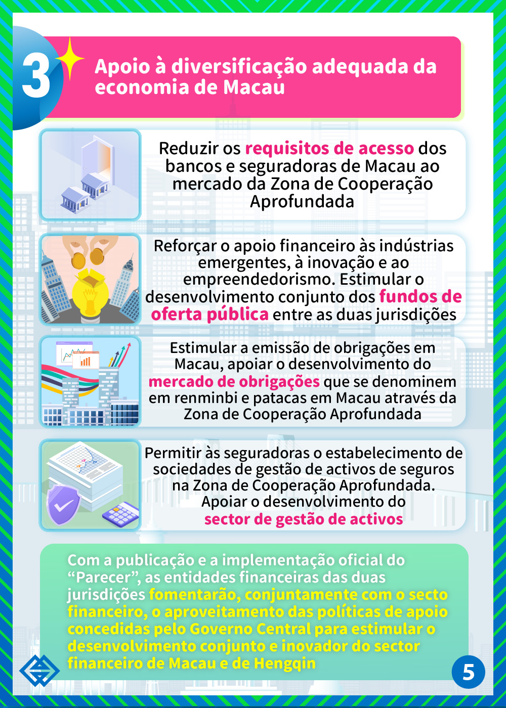 A fim de promover a diversificação adequada da economia de Macau, o Governo da RAEM encontra-se focado no desenvolvimento das actividades financeiras modernas. O “Parecer” propõe a redução dos requisitos de acesso ao mercado das instituições financeiras de Macua, a promoção do estabelecimento de diferentes tipos de instituições financeiras na Zona de Cooperação Aprofundada, alargando o âmbito do mercado de Macau, em articulação com o desenvolvimento das actividades financeiras modernas, incluindo as actividades relativas a obrigações, gestão de fortunas e locação financeira.