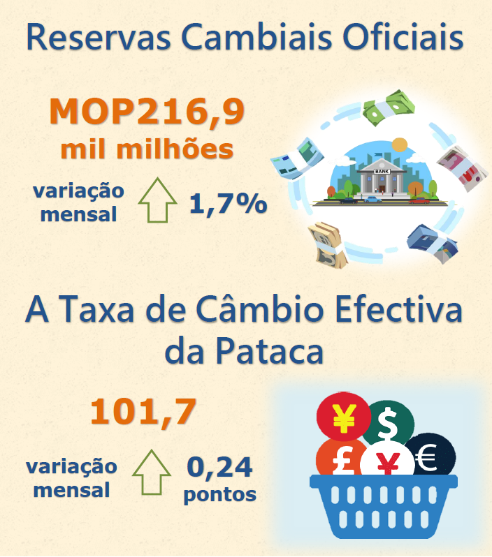 A Autoridade Monetária de Macau (AMCM), divulga hoje as estimativas preliminares das reservas cambiais da RAEM, que se cifraram em MOP216,9 mil milhões (USD26,84 mil milhões) no final de Fevereiro de 2023, tendo aumentado 1,7% relativamente aos dados rectificados do mês anterior, que atingiram MOP213,3 mil milhões (USD26,43 mil milhões). No final de Fevereiro de 2023, as reservas cambiais da RAEM registaram cerca de 10 vezes em relação à circulação monetária, ou 82,1% do agregado monetário M2 em MOP, no final de Janeiro de 2023.