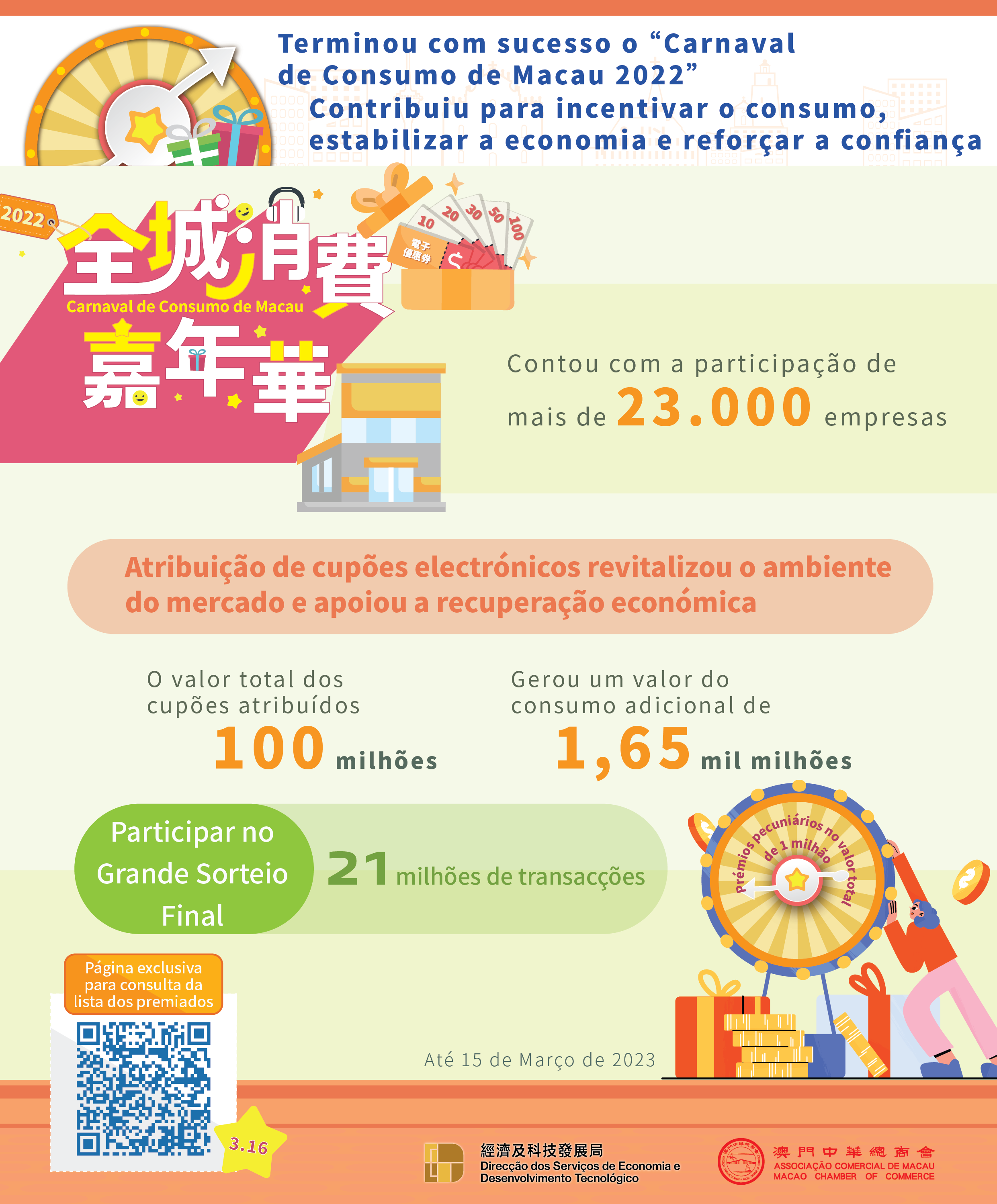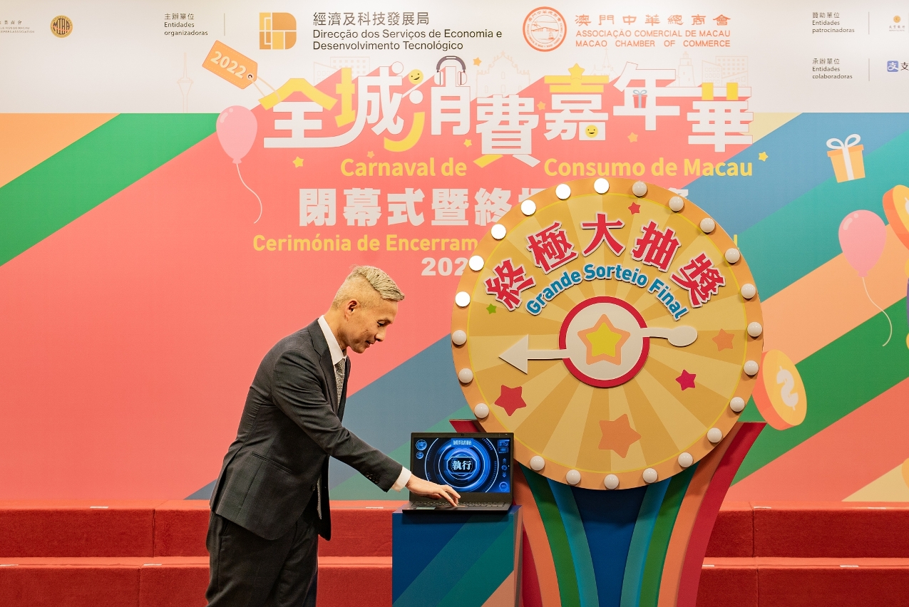 Organizado conjuntamente pela Direcção dos Serviços de Economia e Desenvolvimento Tecnológico (DSEDT) e Associação Comercial de Macau (ACM), a cerimónia do encerramento e o Grande Sorteio Final do “Carnaval de Consumo de Macau 2022” tiveram lugar hoje (dia 15), no Auditório Comemorativo de Ho Yin, no Edifício da Associação Comercial de Macau.