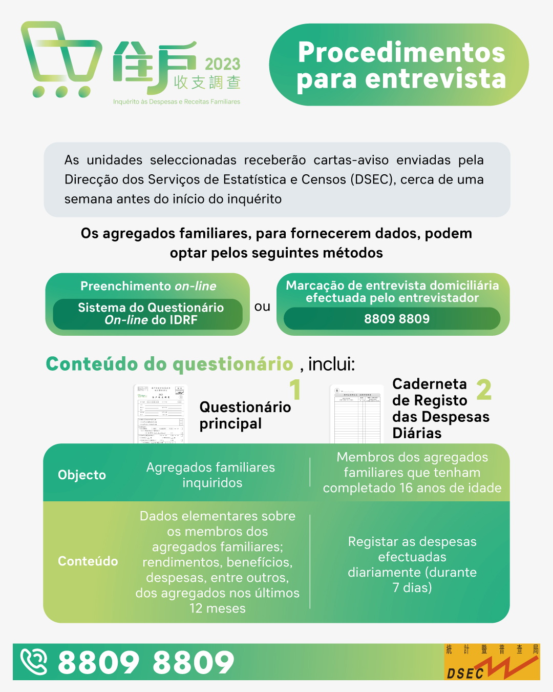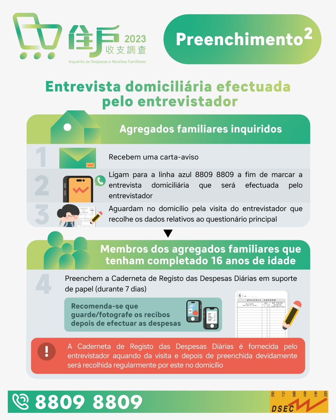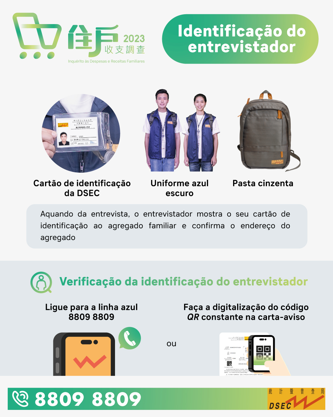 Os agregados familiares também podem ligar para a linha azul 8809 8809, a fim de marcar uma entrevista, na qual o entrevistador visitará os agregados para recolher informações. O entrevistador usará um uniforme azul escuro com o logotipo da DSEC e terá uma pasta cinzenta. Aquando da visita, o entrevistador mostrará ao agregado familiar o seu cartão de identificação e confirmará o endereço do agregado. Caso seja necessário, o agregado familiar pode digitalizar o código QR constante na carta-aviso ou ligar para a linha azul 8809 8809, a fim de consultar ou verificar as informações do entrevistador que o visita.
