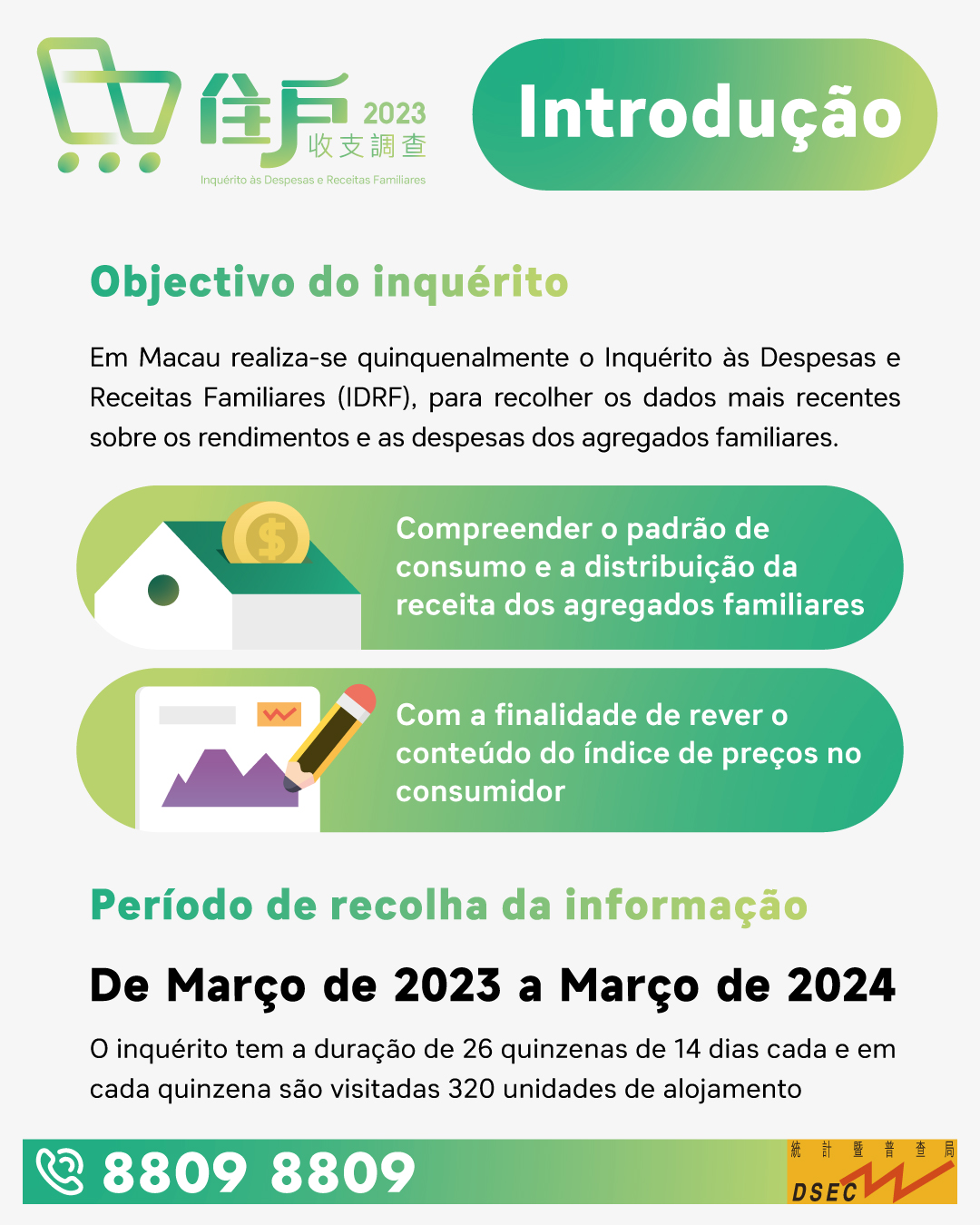 Em Macau realiza-se quinquenalmente o Inquérito às Despesas e Receitas Familiares, de acordo com as recomendações internacionais, para recolher os dados mais recentes sobre os rendimentos e as despesas de consumo dos agregados familiares de Macau. O início da recolha de dados do Inquérito às Despesas e Receitas Familiares 2023 (IDRF 2023), originalmente agendado para Janeiro de 2023, é adiado para 26 de Março do corrente ano, devido ao impacto gerado pela situação pandémica recentemente ocorrida. O período de recolha termina em 23 de Março de 2024 e tem a duração de um ano.