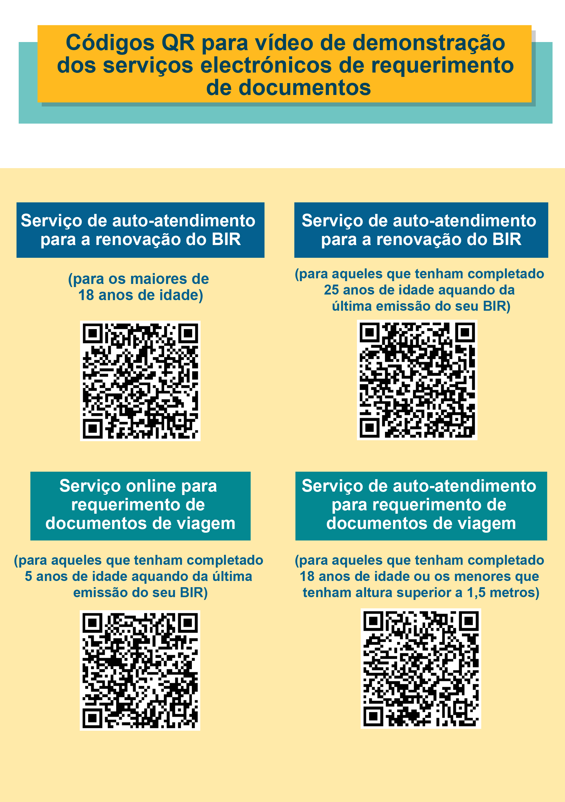 A DSI sugere que os indivíduos que preenchem os requisitos utilizem, prioritariamente, a “Conta Única de Macau” ou os quiosques de auto-atendimento de 24 horas para tratar, por via electrónica, do requerimento de documentos, podendo consultar os vídeos de demonstração dos serviços electrónicos de requerimento de documentos através da leitura dos respectivos códigos QR. Caso os cidadãos pretendam tratar dos requerimentos no balcão de atendimento, podem efectuar a marcação prévia através da funcionalidade “Senha e marcação para o atendimento no balcão” da “Conta Única de Macau” ou da página electrónica da DSI (www.dsi.gov.mo). Para mais informações, queira ligar para a linha aberta da DSI (2837-0777 ou 2837-0888) ou enviar email para info@dsi.gov.mo.