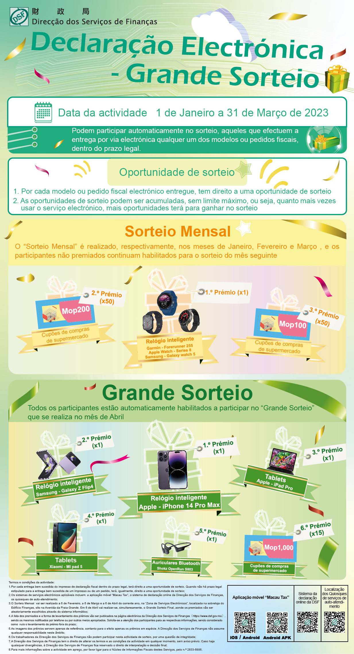 A fim de incentivar a apresentação online, via telemóvel e por quiosque de autoatendimento da declaração fiscal por parte dos contribuintes, a DSF organizou, no primeiro trimestre do corrente ano, especialmente, sorteios no âmbito da declaração electrónica, sendo os mesmos automaticamente considerados como participantes neste evento, desde que, entre 1 de Janeiro e 31 de Março, a entrega da declaração ou do requerimento fiscal tivesse sido efectuada através da aplicação móvel “Macau Tax”, do sistema de declaração online da DSF e dos quiosques de autoatendimento. Os vencedores do sorteio dos meses de Janeiro e de Fevereiro, totalizados 202, foram sorteados, respectivamente, em 6 de Fevereiro e em 6 de Março, tendo os correspondentes prémios sido levantados.