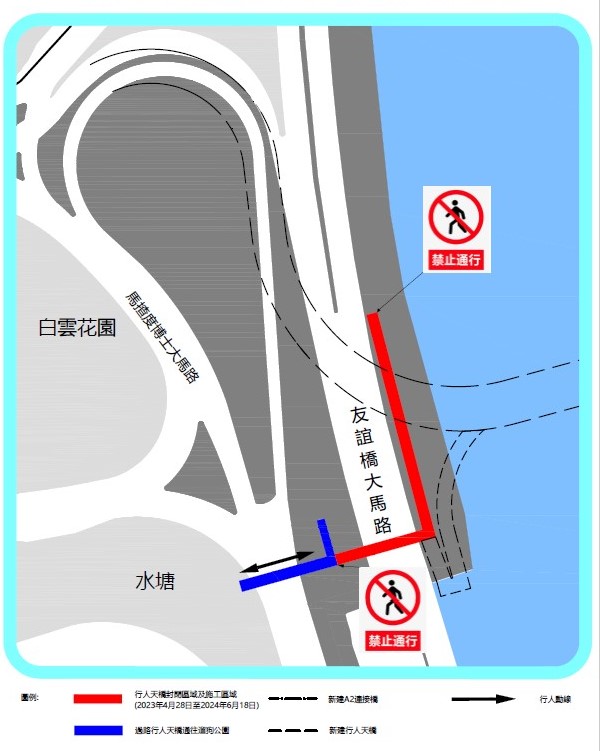 Para articular com as disposições relativas à execução do viaduto da «Empreitada de Construção de Via de Acesso (A2) entre a Zona «A» dos Novos Aterros Urbanos e Península de Macau», a utilização da passagem superior para peões, com acesso entre o Parque do Reservatório até à Avenida da Amizade, será suspensa no período compreendido entre 28 de Abril de 2023 e Julho de 2024, sendo ainda necessário demolir temporariamente o acesso de subida e descida da passagem superior para peões situado ao lado da Avenida da Amizade no intuito de articular com a construção do viaduto, bem como para realização de trabalhos de aperfeiçoamento da passagem superior para peões, os quais incluem a ligação com a passagem superior para peões para fins de interligação até ao lado oeste da Zona A dos Novos Aterros Urbanos.