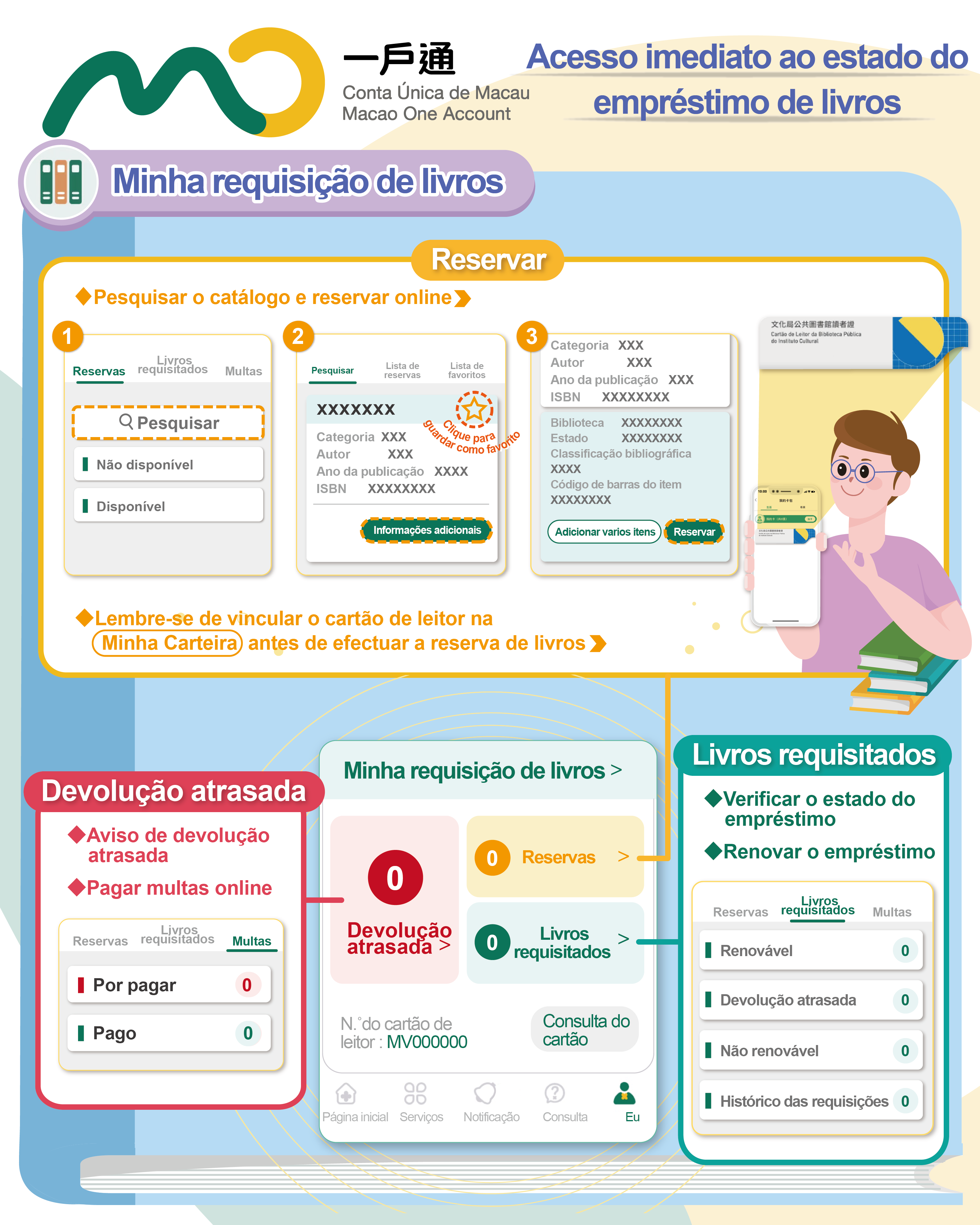 A “Minha requisição de livros” e a nova função de gestão da conta individual somente podem ser utilizadas após a actualização da última versão da aplicação Conta Única de Macau. Caso desejem obter mais informações, acedam à página electrónica temática da Conta Única de Macau (https://www.gov.mo/app/pt) para consultar a infografia ou vídeo de demonstração.