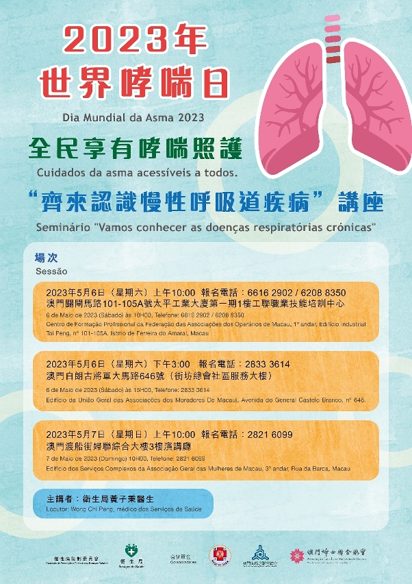 Em resposta à iniciativa do “Dia Mundial da Asma”, os Serviços de Saúde, em conjunto com os membros da Comissão de Prevenção e Controlo das Doenças Crónicas, a União Geral das Associações dos Moradores de Macau, a Federação das Associações dos Operários de Macau e a Associação Geral das Mulheres de Macau, 6 e 7 de Maio, realizaram três sessões do seminário comunitário sobre “ Vamos conhecer as doenças respiratórias crónicas”, destinadas aos residentes sobre as causas e métodos de prevenção das doenças respiratórias crónicas mais frequentes, nomeadamente a asma e a doença pulmonar obstrutiva crónica, no sentido de reforçar os conhecimentos da população, no âmbito das doenças respiratórias crónicas e tomar, com a maior brevidade possível, as medidas preventivas de saúde.