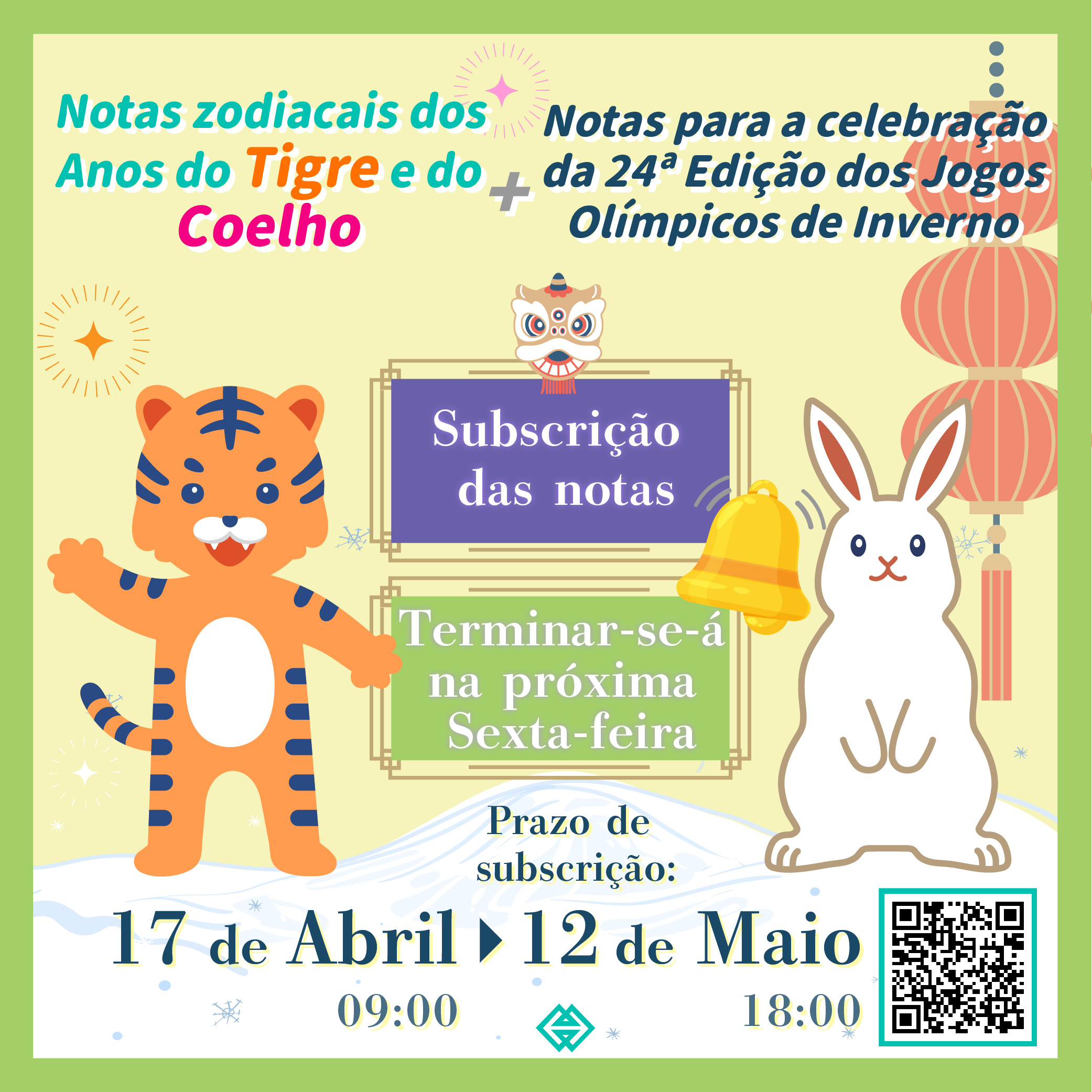O termo do prazo para subscrição “on-line” das notas zodiacais dos Anos do Tigre e do Coelho e de notas para a celebração da 24ª Edição dos Jogos Olímpicos de Inverno decorrerá até às 18 horas de 12 de Maio de 2023 (Sexta-feira), sendo que a Autoridade Monetária de Macau (AMCM) informa os residentes que pretendam subscrever as notas em causa que o devem fazer, até ao termo do prazo indicado.