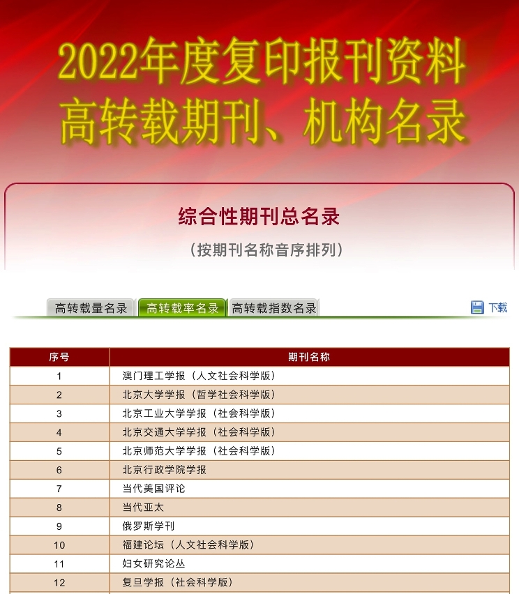 A “Lista dos Periódicos Reimprimidos com Alta Frequência no Ano de 2022” foi elaborada pelo Centro de Informação de Livros e Jornais da URC, com base em três dimensões, nomeadamente o número de reimpressões, a taxa de reimpressão e o índice abrangente, de acordo com os dados dos materiais reimprimidos na URC, relativos à reimpressão do texto inteiro de quase 100 tipos de periódicos académicos. Após a classificação das disciplinas de segundo nível das ciências humanas e sociais, bem como a respectiva edição e publicação, a publicação sobre os materiais reimprimidos é uma fonte secundária dos resultados na área das ciências humanas e sociais, seleccionados entre cerca de 4000 tipos de periódicos divulgados publicamente no País.