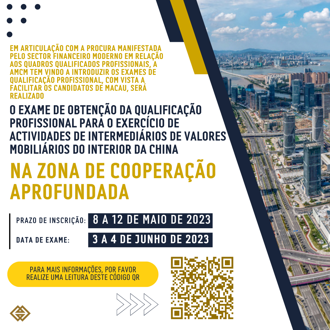 Em articulação com a procura manifestada pelo sector financeiro moderno em relação aos quadros qualificados profissionais, e através dos esforços prestados pela Autoridade Monetária de Macau, o “Exame Uniformizado para a avaliação do nível das competências dos trabalhadores profissionais do sector dos valores mobiliários” do Interior da China será realizado na Zona de Cooperação Aprofundada entre Guangdong e Macau em Hengqin (Zona de Cooperação Aprofundada), sendo que o primeiro exame terá lugar nos dias 3 e 4 de Junho do corrente ano, tendo-se iniciado as respectivas inscrições a partir de hoje até 12 de Maio, podendo os interessados inscrever-se através da página electrónica da Securities Association of China.