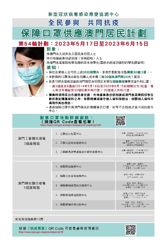 O Centro de Coordenação de Contingência do Novo Tipo de Coronavírus informa que, será lançado o 54.º Programa de fornecimento de máscaras aos residentes de Macau a partir de 17 de Maio de 2023, conforme a seguir discriminado: