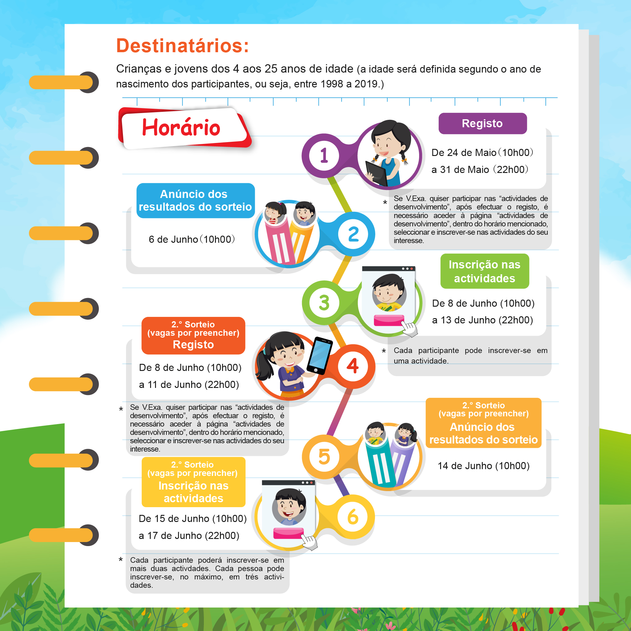 Poderão aceder à página electrónica para verificar e seleccionar as actividades desejadas antes da inscrição, e colocar as actividades interessadas no “meu favorito”, assim poderá poupar tempo no acto de inscrição. O sorteio apenas atribuirá po horário da inscrição online, as vagas serão preenchidas por ordem de chegada.
