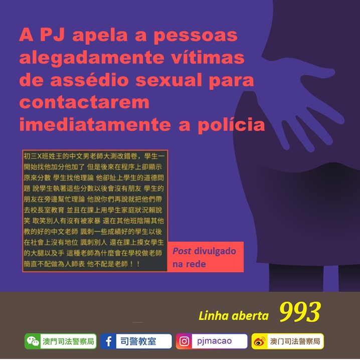 A PJ está a apurar a veracidade da factualidade de um post anónimo e divulgado na rede relacionado com assédio sexual, segundo o qual, um professor de uma escola assediou sexualmente uma aluna. A PJ ainda não recebeu nenhuma queixa relacionada com este assunto, e apela à vítima ou indivíduos que tenham conhecimento desse incidente para que contactem imediatamente a polícia através da linha aberta 993.