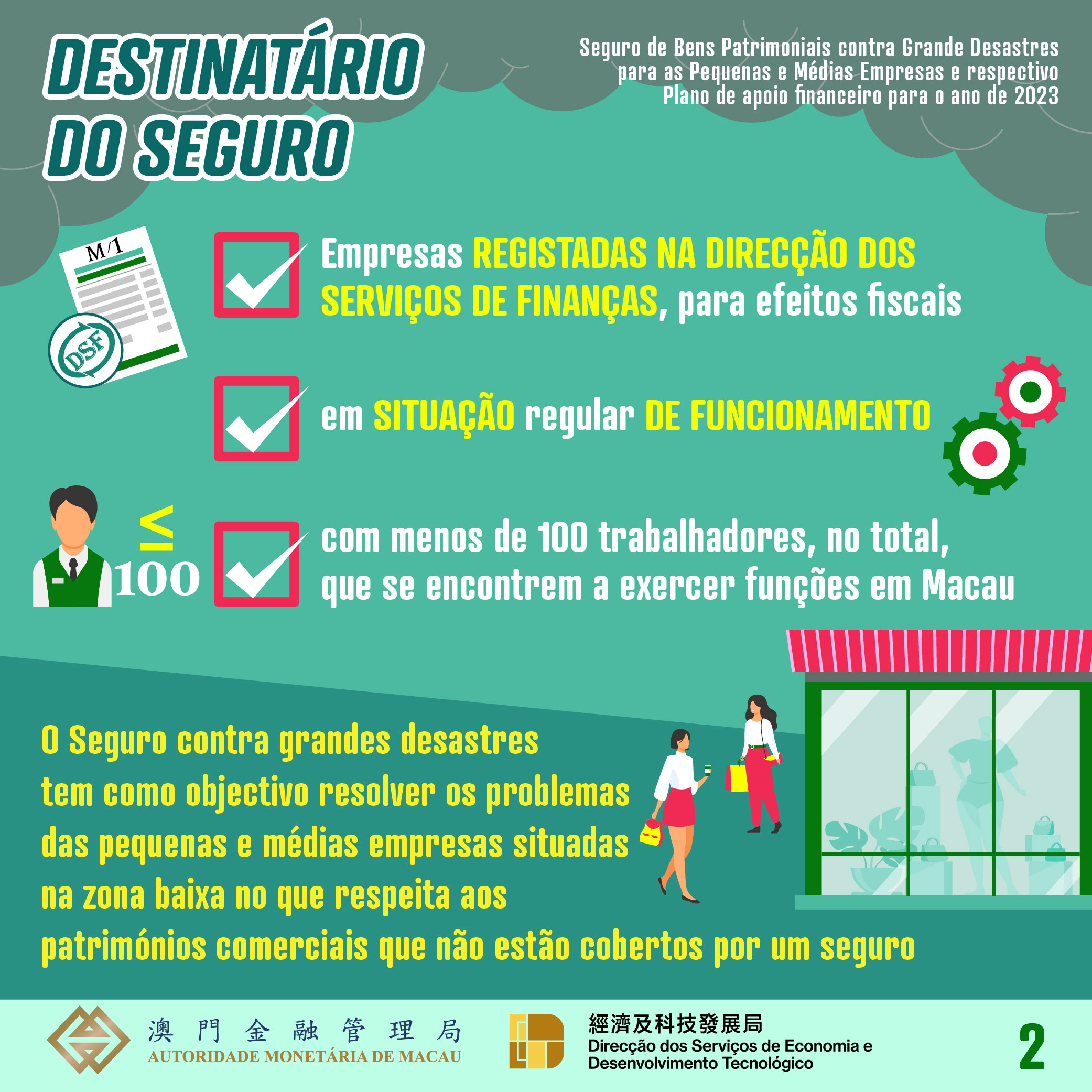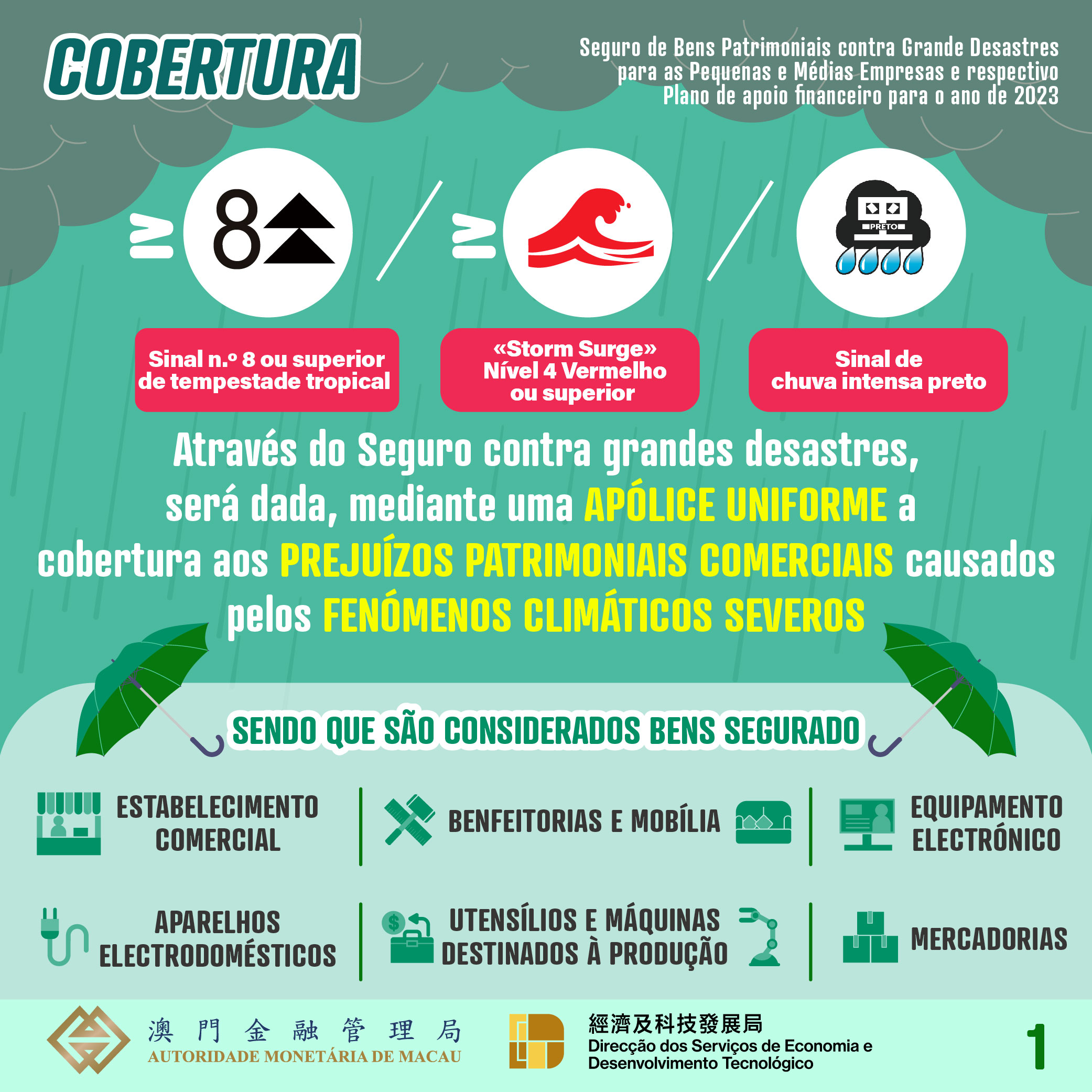 No período compreendido entre a data de hoje e até a 29 de Dezembro de 2023, as PMEs podem subscrever um “Seguro contra grandes desastres” para cada estabelecimento comercial, através das cinco seguradoras de Macau, participantes no plano supramencionado para o ano de 2023. Para além dos valores seguros estabelecidos nos anos anteriores, de MOP100.000, MOP200.000 e MOP300.000, será adicionada uma nova opção de cobertura de MOP500.000 para este ano, permitindo aos comerciantes optarem por adquirir uma cobertura maior. A taxa de prémio foi reduzida, de forma cabal, de 40% para 15% em todos os casos, sendo os prémios correspondentes aos montantes de cobertura acima referidos de MOP15.000, MOP30.000, MOP45.000 e MOP75.000.