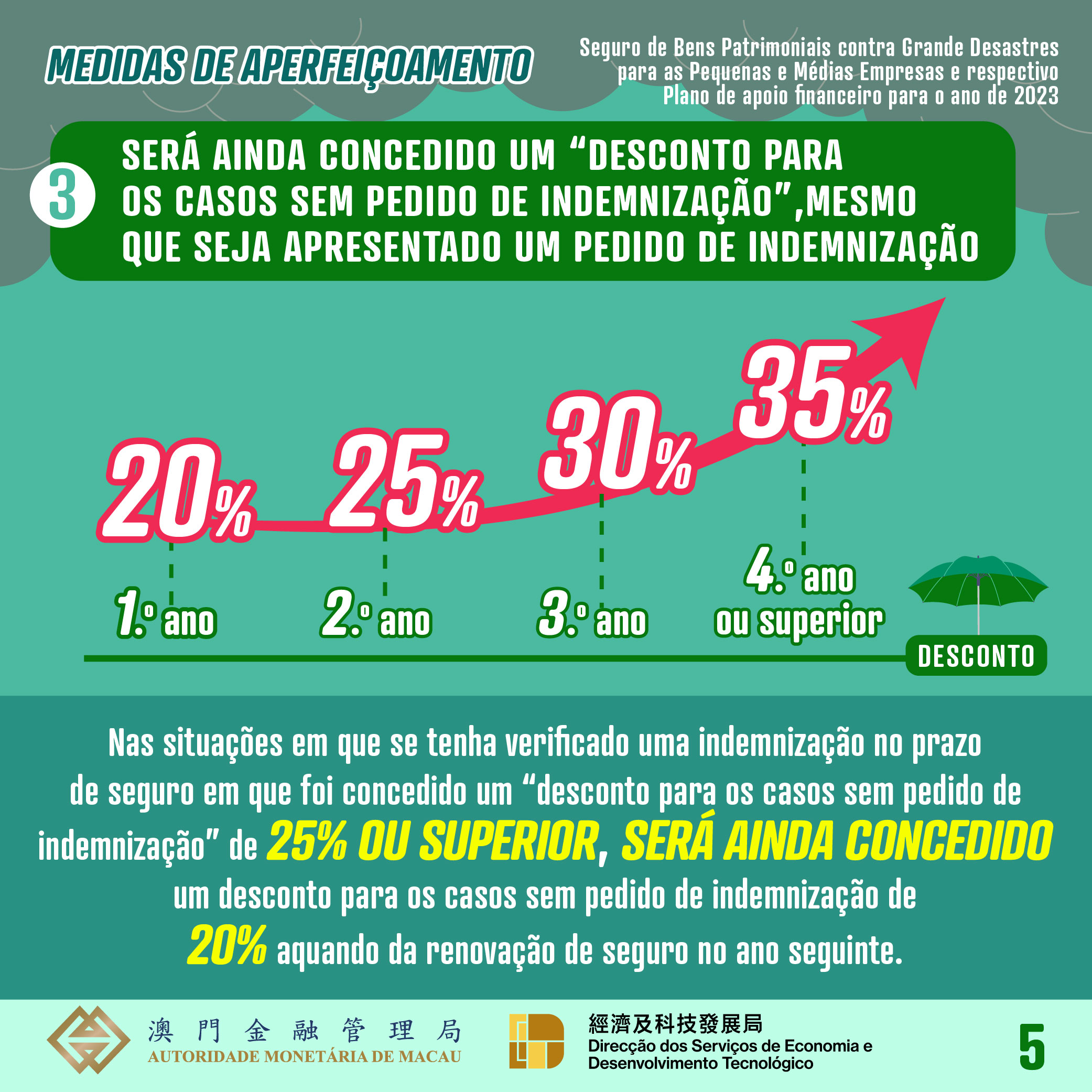 Por outra lado, será dada a continuidade à medida de concessão de descontos nos prémios aos comerciantes que nunca apresentaram pedido de indemnização aquando da renovação de seguro, sendo os descontos de 20%, 25%, e 30% para o primeiro ano, segundo ano e terceiro ano de renovação de seguro, respectivamente e, em relação às renovações a afectuar no quarto ano ou nos anos seguintes, serão concedidos descontos de 35%. Além disso, a partir deste ano, no caso de um comerciante, durante o período em que goza do desconto de 25% ou superior (por não se verificou a apresentação de qualquer pedido de sinistro no passado), apresentar um pedido de indemnização, será concedido no ano seguinte um desconto de 20% nos prémios aquando da renovação do respectivo seguro, sendo que o desconto a conceder será limitado a 35% numa base anual, aquando da renovação de seguro, se não for apresentado qualquer novo pedido de indemnização.