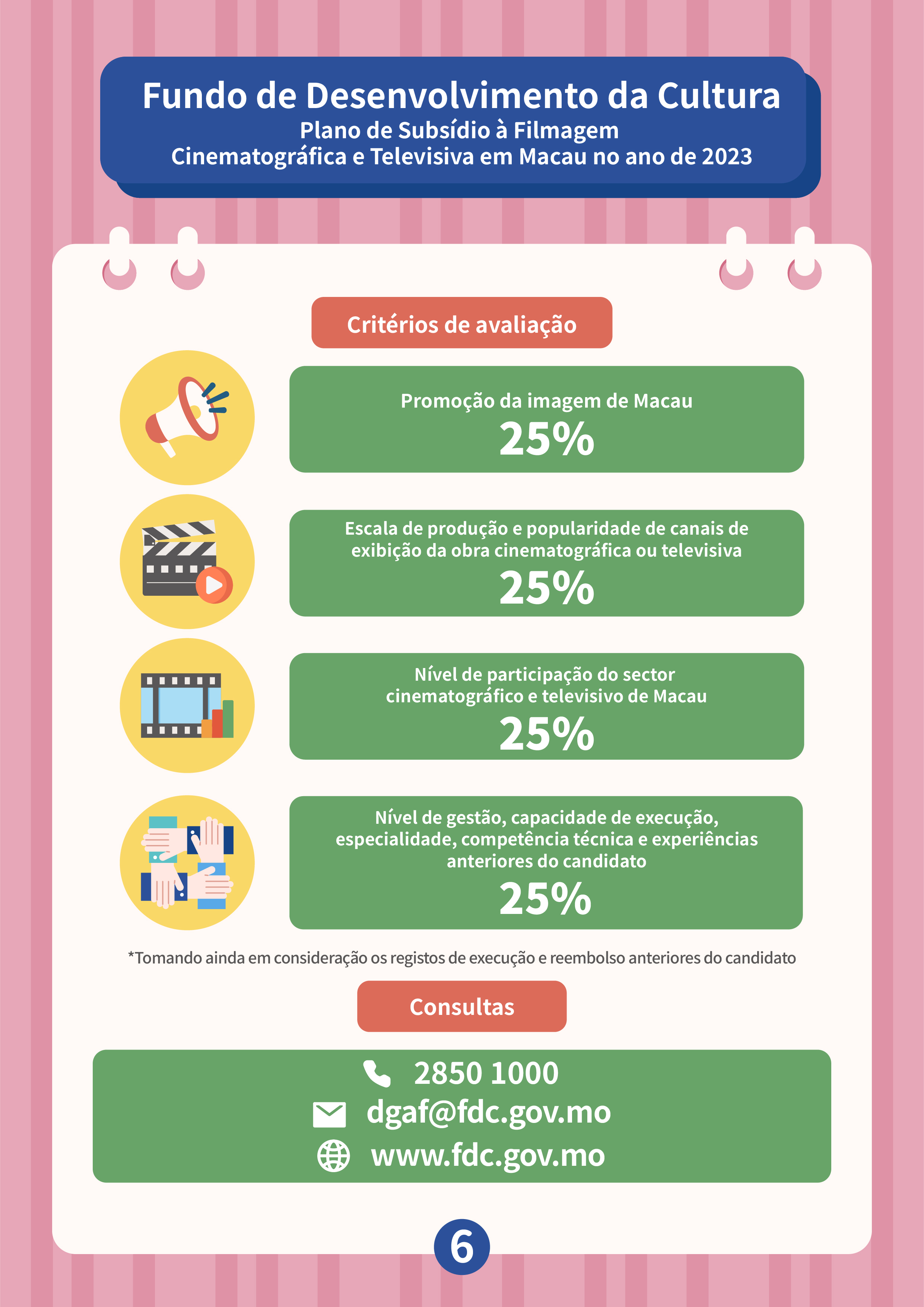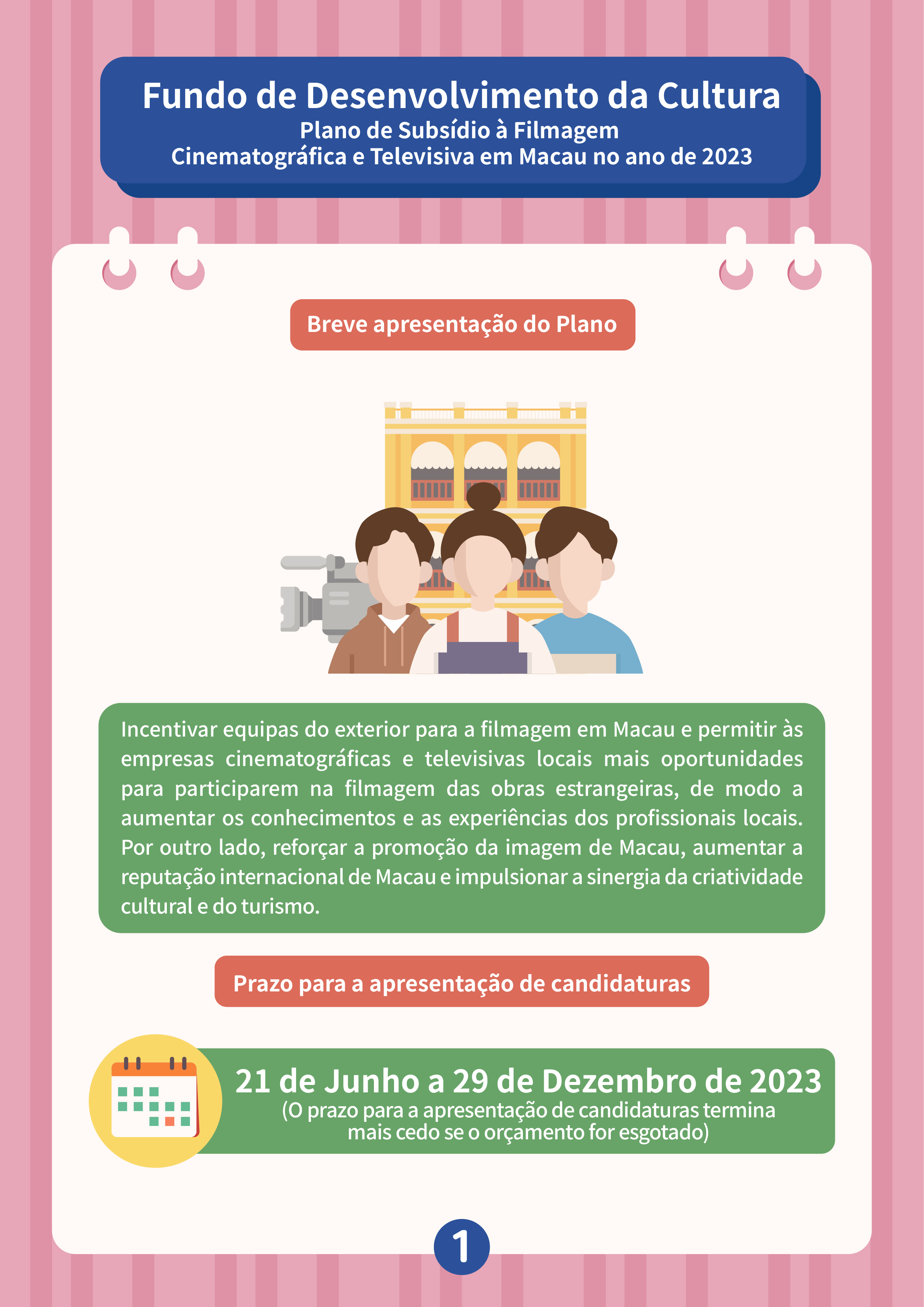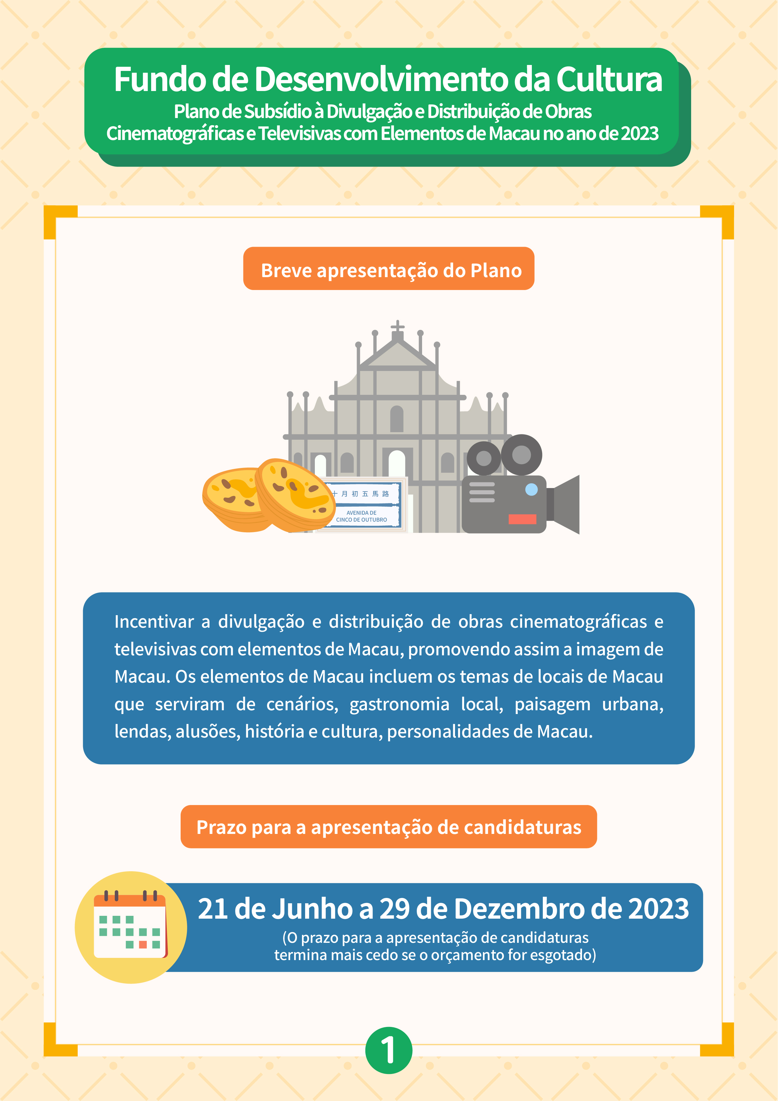 O “Plano de subsídio à filmagem cinematográfica e televisiva em Macau” tem por objectivo atrair equipas estrangeiras para a filmagem em Macau, e promover a imagem da cidade e melhorar a reputação internacional de Macau, através de produções cinematográficas e televisivas, proporcionando mais oportunidades para as empresas locais desta área a participarem nas filmagens de produções estrangeiras. Serão aceites projectos estrangeiros que ainda não tenham sido filmados em Macau antes do prazo para apresentação de candidaturas (21 de Junho de 2023) e o tempo de filmagem em Macau não será inferior a três dias, sendo dirigidos por equipas de filmagem estrangeiras, as quais terão de vir a Macau para a respectiva filmagem. As candidaturas devem ser apresentadas pelos empresários comerciais que sejam unidades de produção em Macau. Dentro do prazo de apoio financeiro, a exibição pública do filme deve estar concluída, do qual, a duração e os locais de Macau que serviram de cenários do filme não podem ser inferiores ao limite de tempo especificado. O valor máximo a conceder é de 40% das despesas orçamentais para a realização da filmagem em Macau, até 2 milhões de patacas.