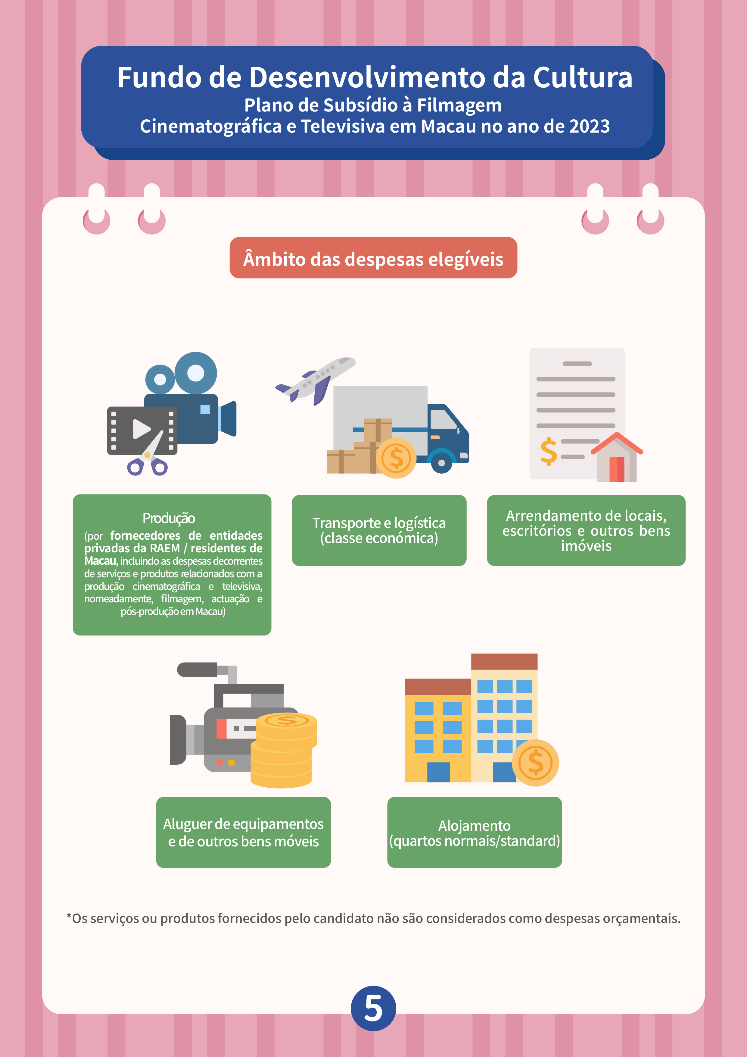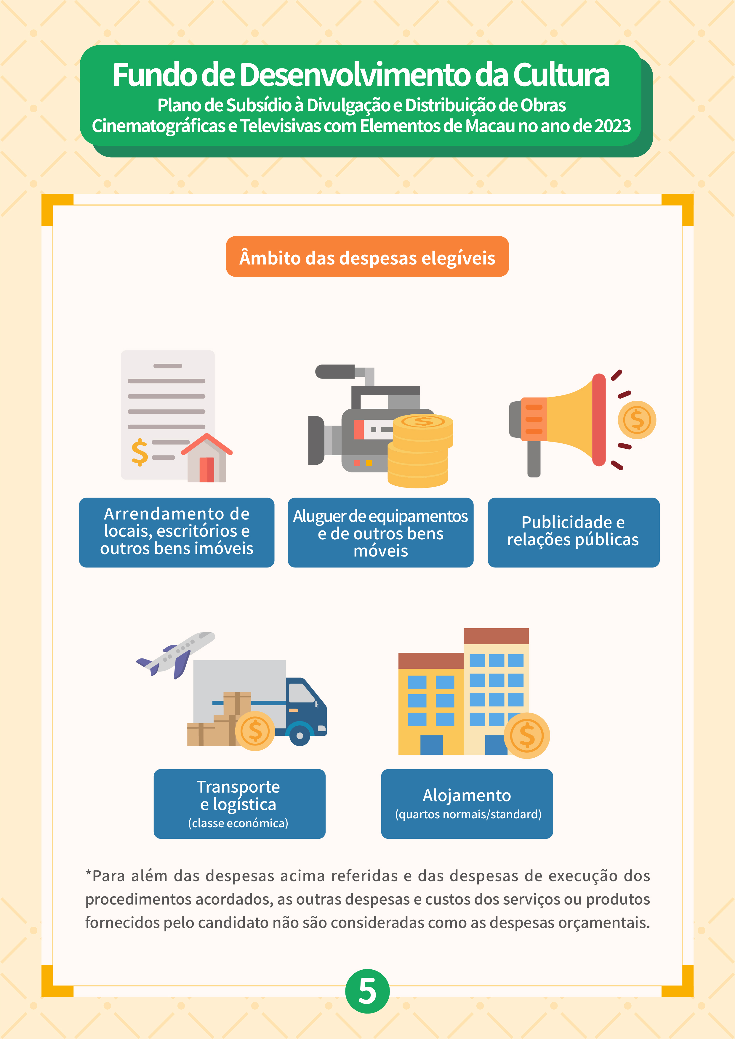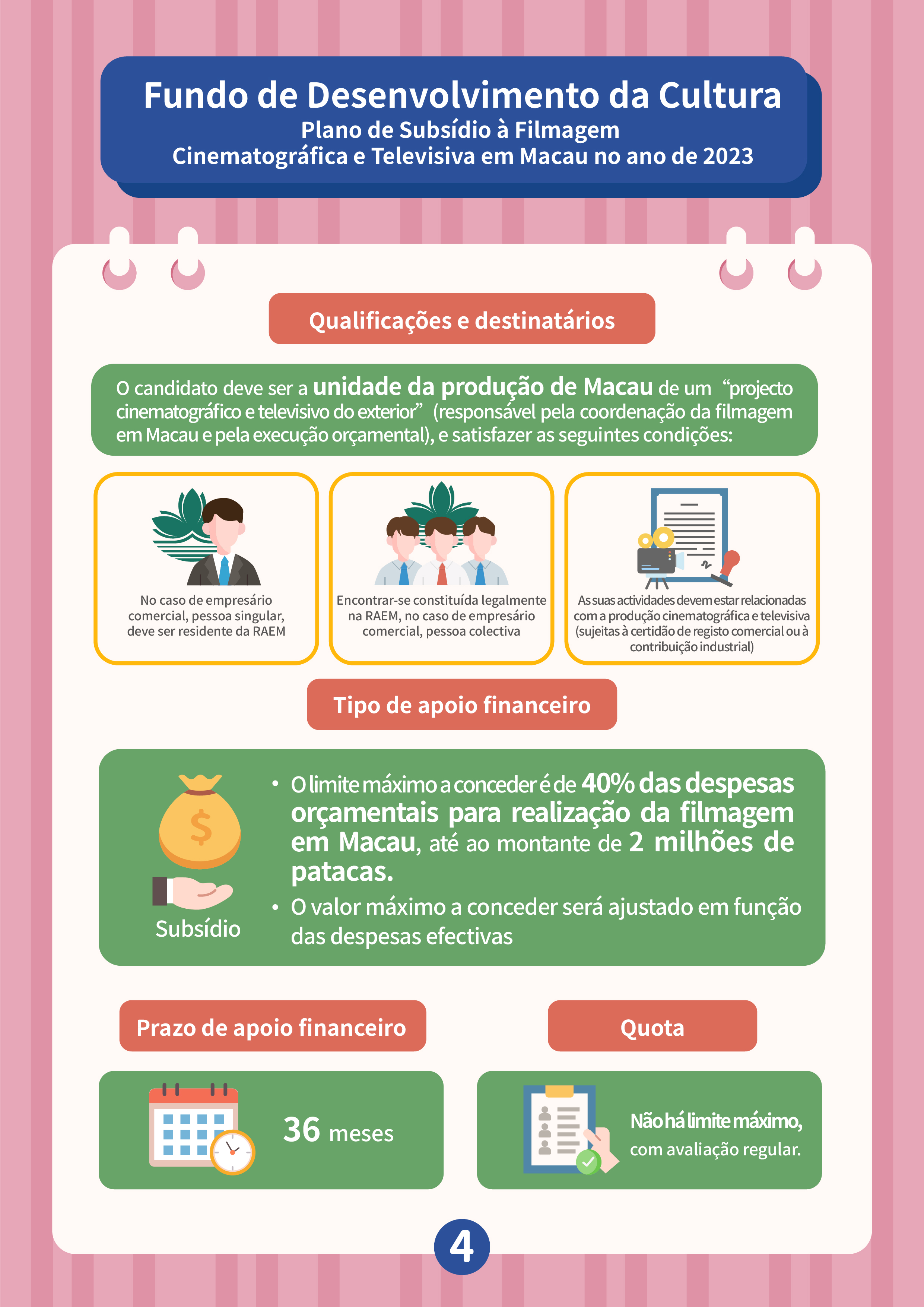 O “Plano de subsídio à filmagem cinematográfica e televisiva em Macau” tem por objectivo atrair equipas estrangeiras para a filmagem em Macau, e promover a imagem da cidade e melhorar a reputação internacional de Macau, através de produções cinematográficas e televisivas, proporcionando mais oportunidades para as empresas locais desta área a participarem nas filmagens de produções estrangeiras. Serão aceites projectos estrangeiros que ainda não tenham sido filmados em Macau antes do prazo para apresentação de candidaturas (21 de Junho de 2023) e o tempo de filmagem em Macau não será inferior a três dias, sendo dirigidos por equipas de filmagem estrangeiras, as quais terão de vir a Macau para a respectiva filmagem. As candidaturas devem ser apresentadas pelos empresários comerciais que sejam unidades de produção em Macau. Dentro do prazo de apoio financeiro, a exibição pública do filme deve estar concluída, do qual, a duração e os locais de Macau que serviram de cenários do filme não podem ser inferiores ao limite de tempo especificado. O valor máximo a conceder é de 40% das despesas orçamentais para a realização da filmagem em Macau, até 2 milhões de patacas.