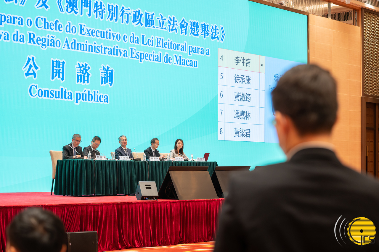 O Governo da Região Administrativa Especial de Macau (RAEM) realizou, hoje (dia 26), pelas 15:00 horas, no Complexo da Plataforma de Serviços para a Cooperação Comercial entre a China e os Países de Língua Portuguesa, a 4.ª sessão de consulta destinada aos diversos sectores sobre a revisão da Lei Eleitoral para o Chefe do Executivo e da Lei Eleitoral para a Assembleia Legislativa da Região Administrativa Especial de Macau, no sentido de auscultar opiniões e sugestões dos serviços subordinados às áreas da Administração e Justiça, da Segurança e dos Transportes e Obras Públicas, bem como das respectivas comissões consultivas, com a participação de mais de 170 pessoas.