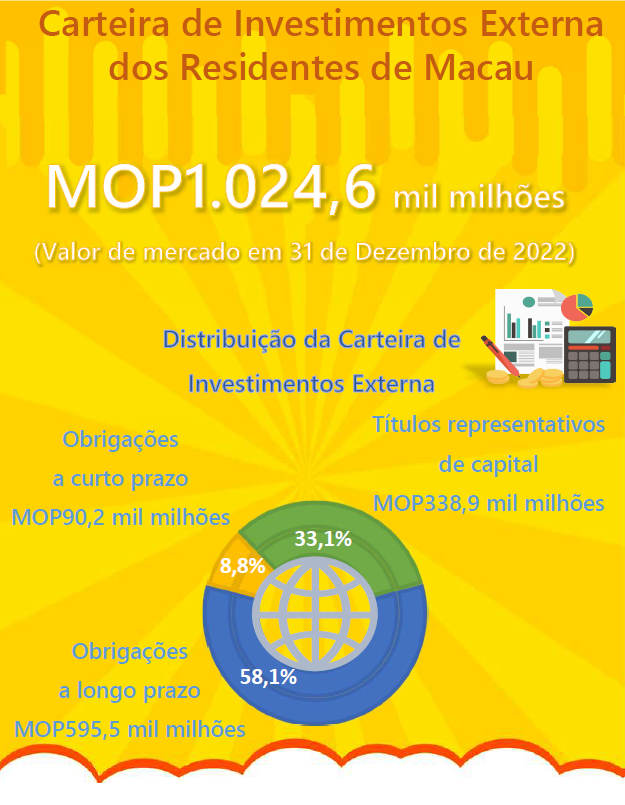 Nas estatísticas divulgadas pela Autoridade Monetária de Macau constata-se que os investimentos dos residentes de Macau - incluindo os indivíduos, governo e outras pessoas colectivas, mas excluindo as reservas cambiais da Região Administrativa Especial de Macau (RAEM) - em títulos emitidos por entidades não residentes independentes, calculados a preços de mercado em 31 de Dezembro de 2022, registaram um valor de 1.024,6 mil milhões de patacas, ou seja, +1,8% face a 30 de Junho de 2022 e -6,7% face ao final de 2021. Entre os vários componentes da carteira, os investimentos em títulos representativos de capital (incluindo fundos mútuos e investimentos em trusts), obrigações a longo prazo e obrigações a curto prazo alcançaram, respectivamente, 338,9 mil milhões, 595,5 mil milhões e 90,2 mil milhões de patacas em valor de mercado, traduzindo variações respectivas de -12,9%, -8,0% e +46,6%, em relação ao final de 2021.