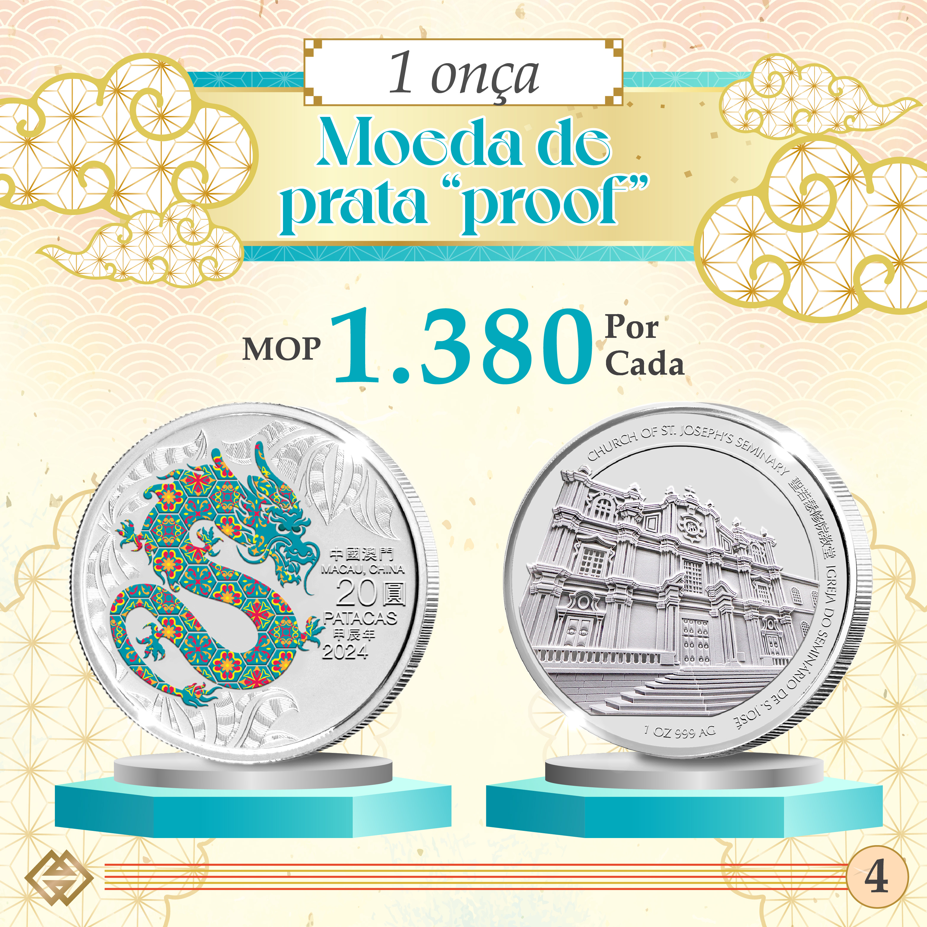 O anverso da moeda comemorativa do Ano Novo Lunar do Dragão é constituído por um desenho de um signo zodiacal tradicional chinês relativo ao ano lunar, feito de azulejos desenhados de cores variadas e de estilo português, enquanto que no reverso da moeda comemorativa, o desenho é apresentado de uma perspectiva ascedente, através da nova tecnologia de escultura relevo, esculpido num local do Património Cultural de Macau, Igreja do Seminário de S. José. Ora, as moedas comemorativas do Ano Lunar do Dragão são constituídas por uma moeda de prata “proof” com 1 onça, uma moeda de prata “proof” com 5 onças e uma moeda de ouro “proof” com 0,5 onça. Os preços dos três tipos de moedas comemorativas são 1.380 patacas, 8.000 patacas e 16.500 patacas, respectivamente.