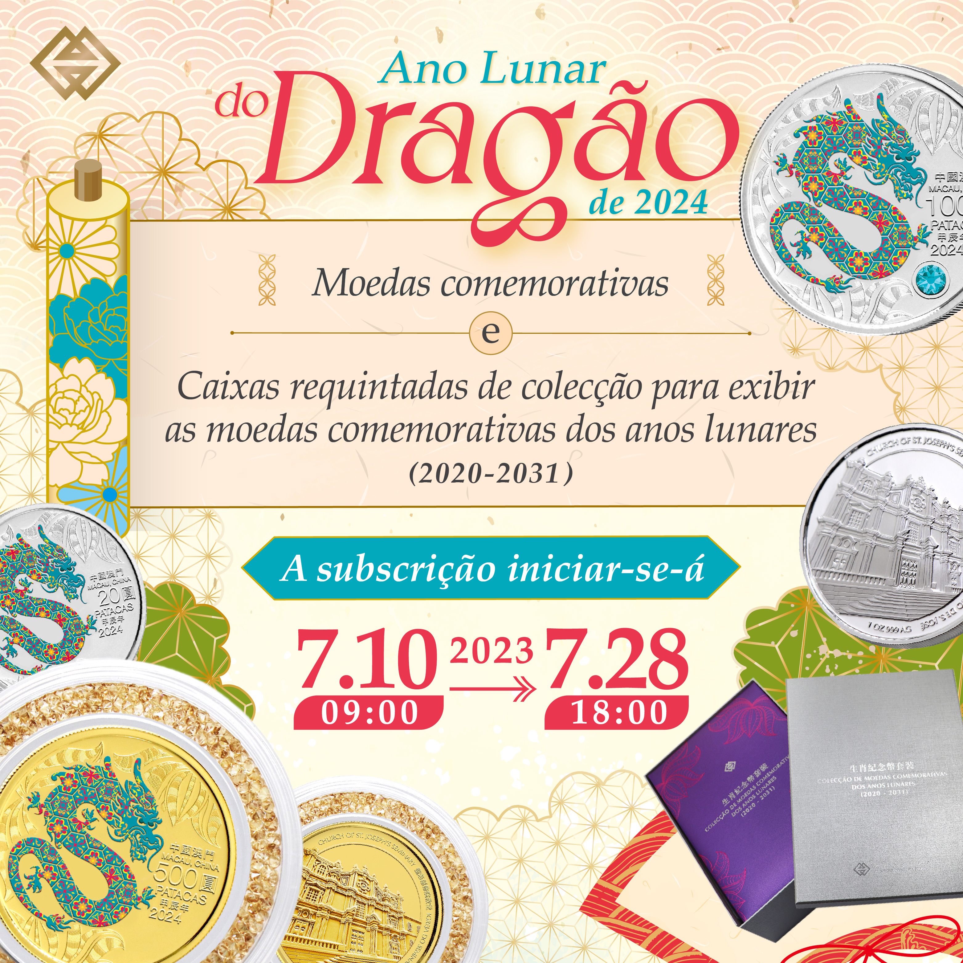 A Autoridade Monetária de Macau (AMCM) emitirá, em breve, as moedas comemorativas do Ano Novo Lunar do Dragão (2024), as quais poderão ser subscritas “online” a partir da próxima segunda-feira (dia 10). Em simultâneo, serão lançadas as “Caixas requintadas de colecção para exibir as moedas comemorativas dos anos lunares (2020-2031)”, as quais serão disponibilizadas para os residentes interessados a adquirir todas as 12 moedas comemorativas de prata “proof” com 1 onça da série em causa.