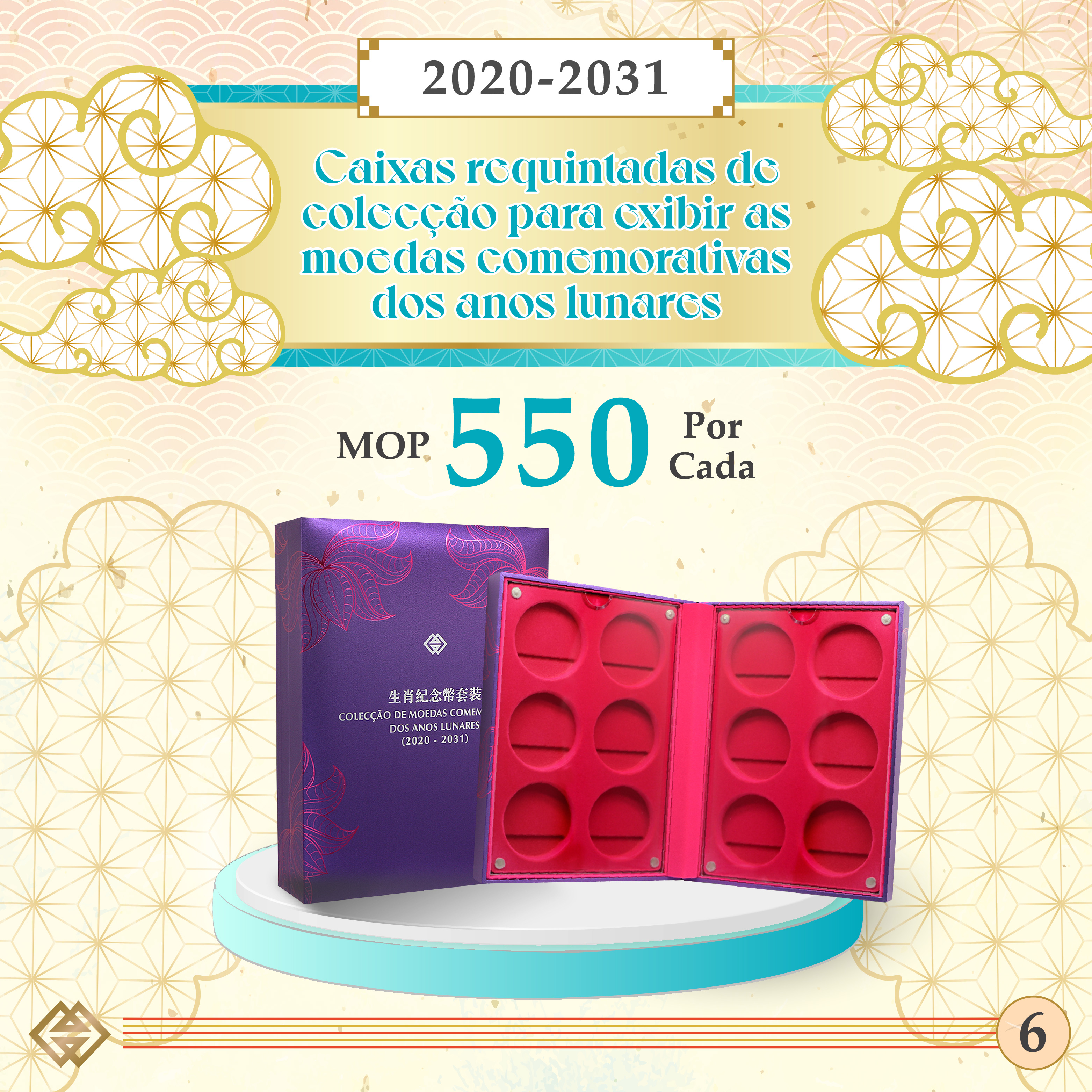 A caixa requintada de colecção é composta por uma caixa exterior prateada e um livro de colecção de moedas comemorativas com tonalidade roxa. Na capa, estão estampados o logotipo da AMCM e a imagem do símbolo de Macau – Lotus, em cor de prata e cor fúcsia, respectivamente. O livro de colecção pode ser exibido na horizontal ou na vertical. O preço de cada caixa requintada de colecção é 550 patacas.