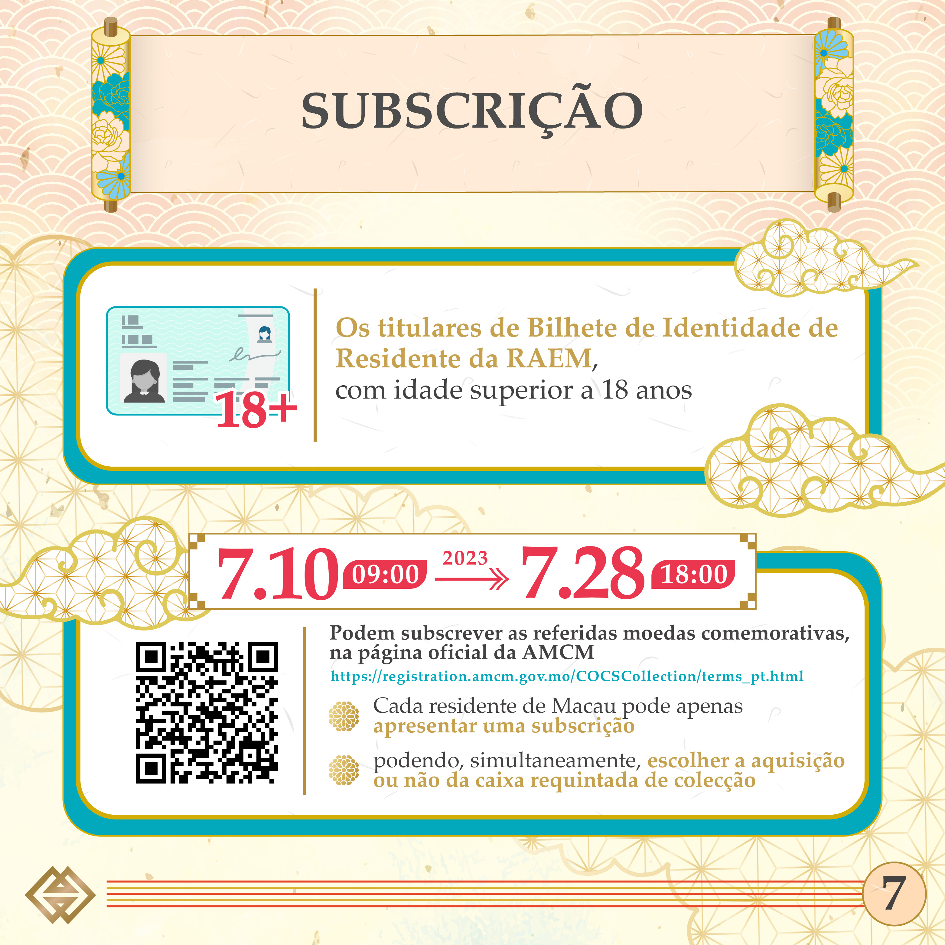 Os titulares de Bilhete de Identidade de Residente válido, com idade mínima de 18 anos, podem subscrever as referidas moedas comemorativas, das 9:00 horas do dia 10 de Julho de 2023 às 18:00 horas do dia 28 de Julho de 2023, através do “website” da AMCM (https://registration.amcm.gov.mo/COCSCollection/terms_pt.html). Durante o período de subscrição supramencionado, será instalado um balcão, no “átrio” da AMCM, ao serviço dos cidadãos que necessitem de assistência.
