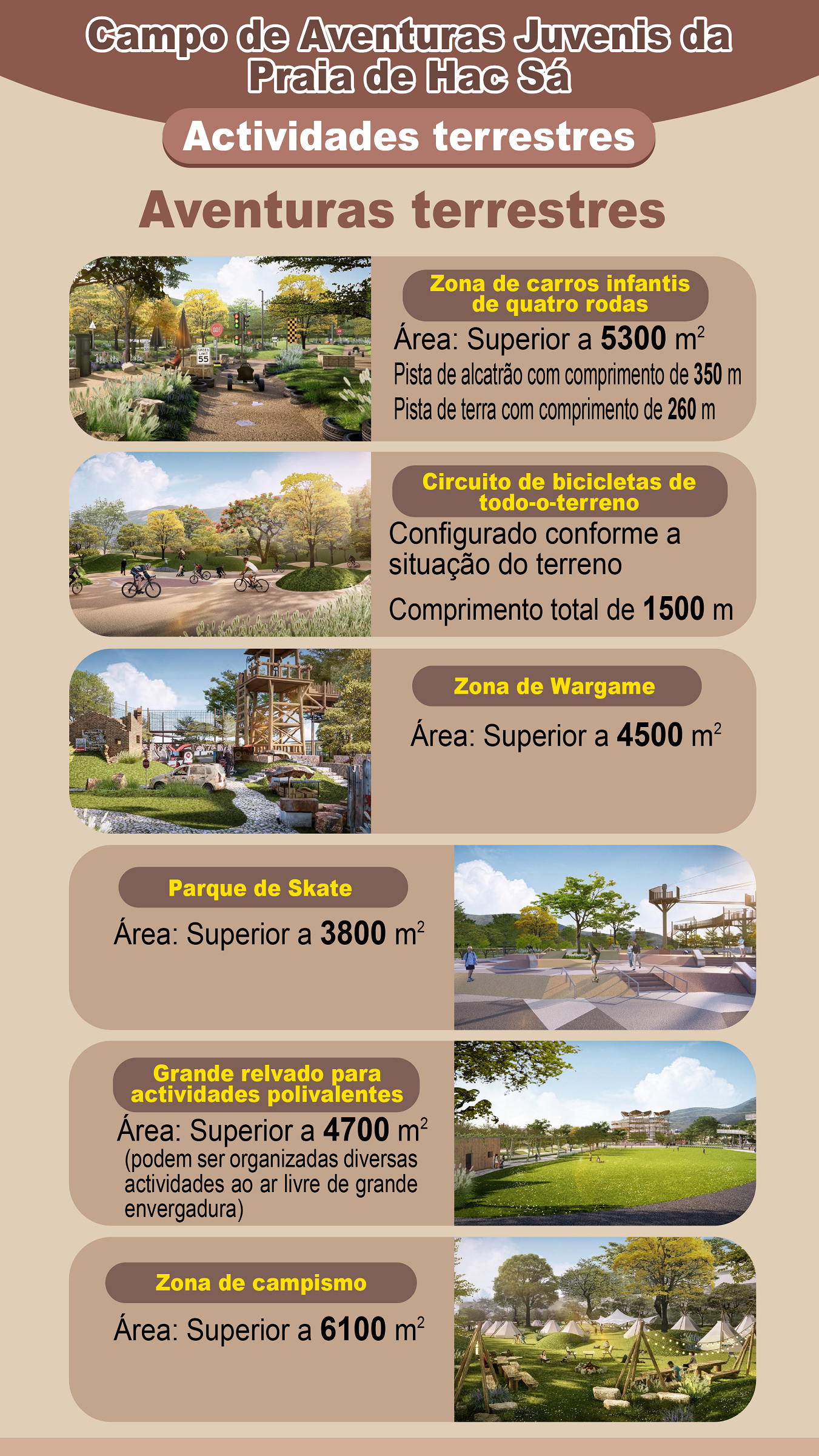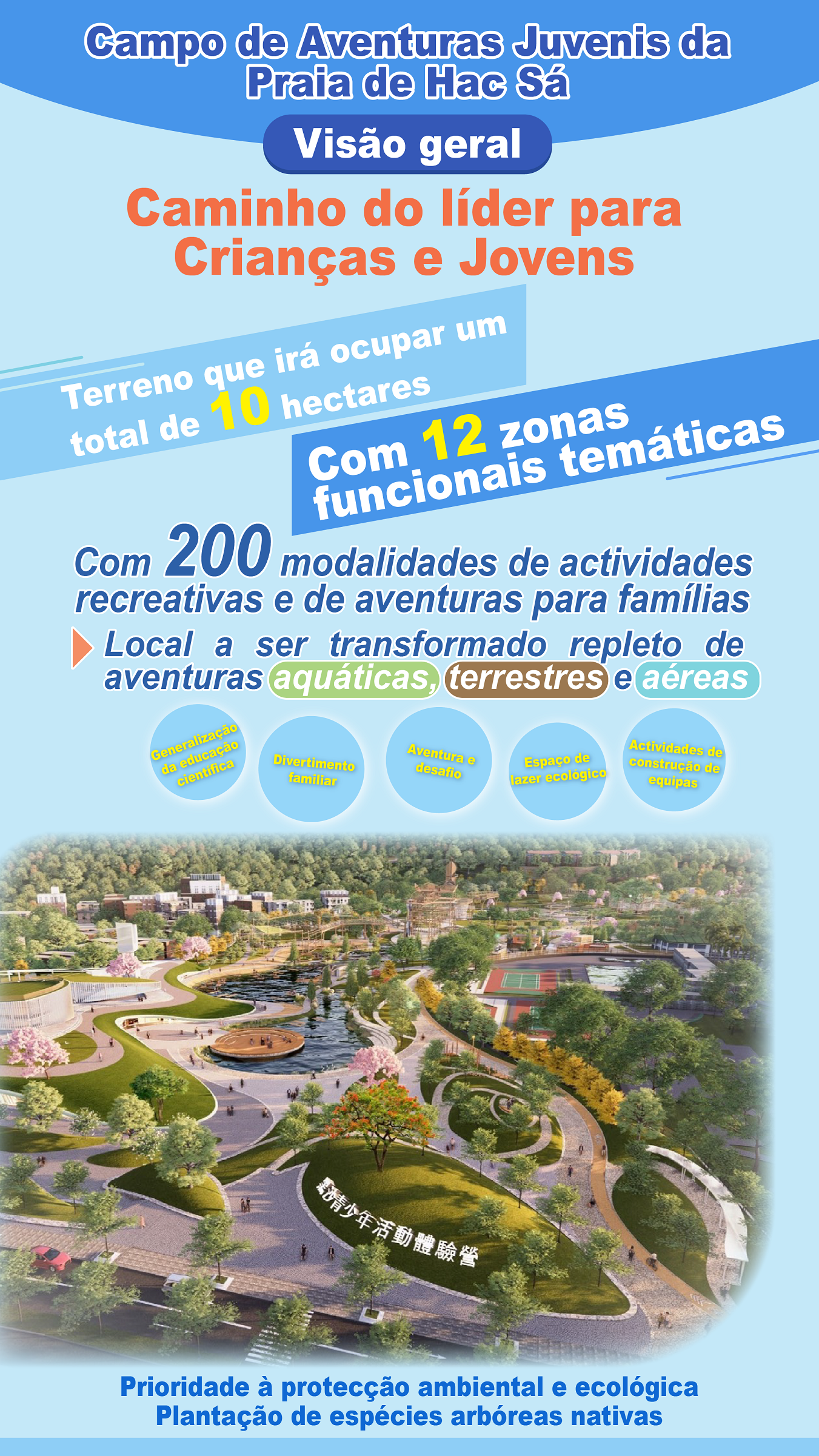 O Campo de Aventuras Juvenis da Praia de Hac Sá, com uma área total de 10 hectares, além de contar com 12 áreas funcionais temáticas e mais de 200 modalidades de aventura “aquática, terrestre e aérea”, nele será construída uma série de instalações complementares, tais como infra-estruturas de prevenção de inundações e de drenagem, parques de estacionamento, centro de actividades e espaço de restauração, a fim de criar o maior campo de aventuras em Macau e nas regiões vizinhas, oferecendo experiências de aventura “aquática, terrestre e aérea” tridimensional a crianças, adolescentes e jovens.